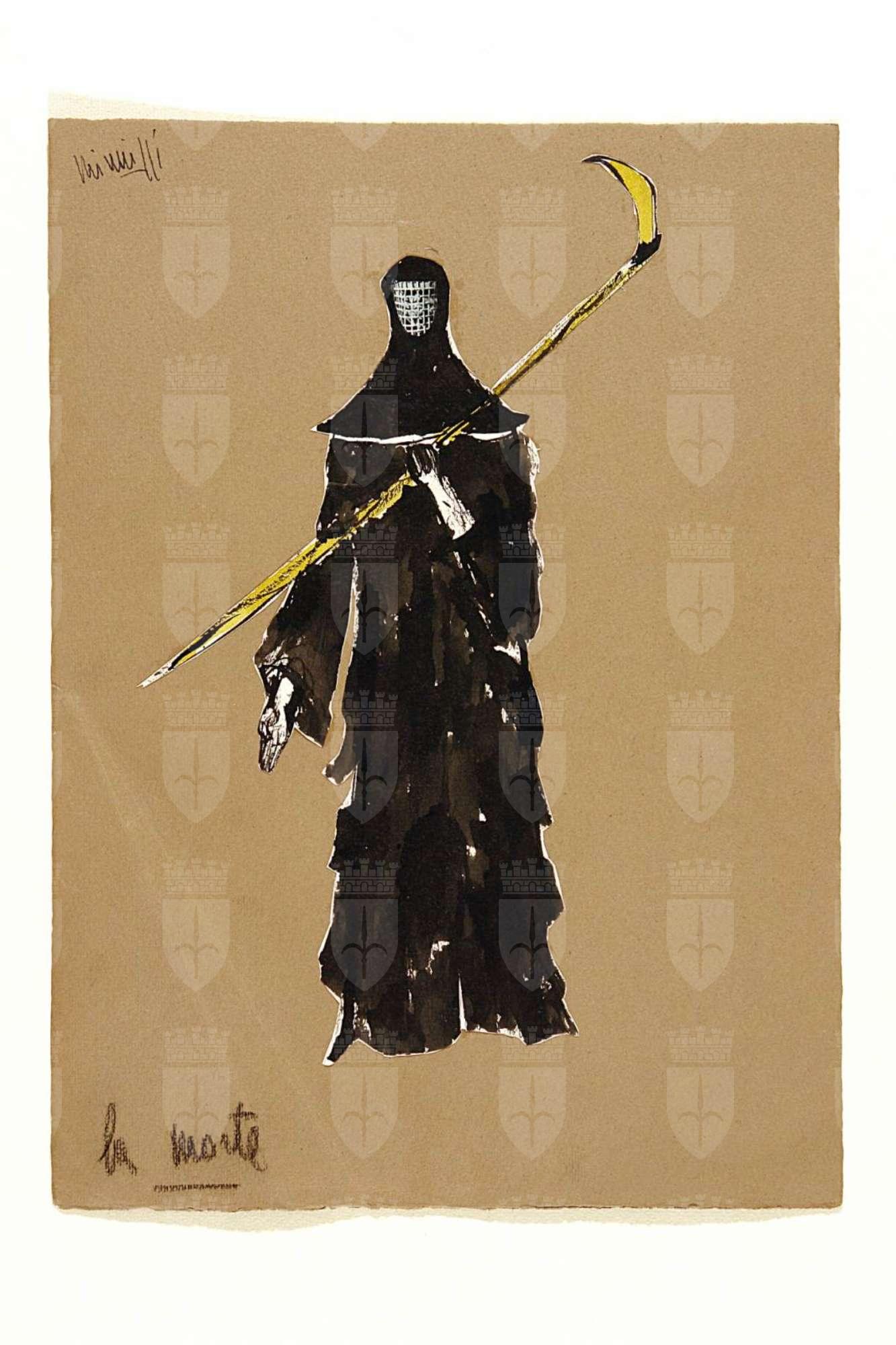 L'anno della peste, sacra rappresentazione su testi medievali raccolti da Sergio Miniussi. La morte, figura intera in abito nero lungo coperto da cappuccio, volto coperto da retina, la mano sinistra sorregge una falce