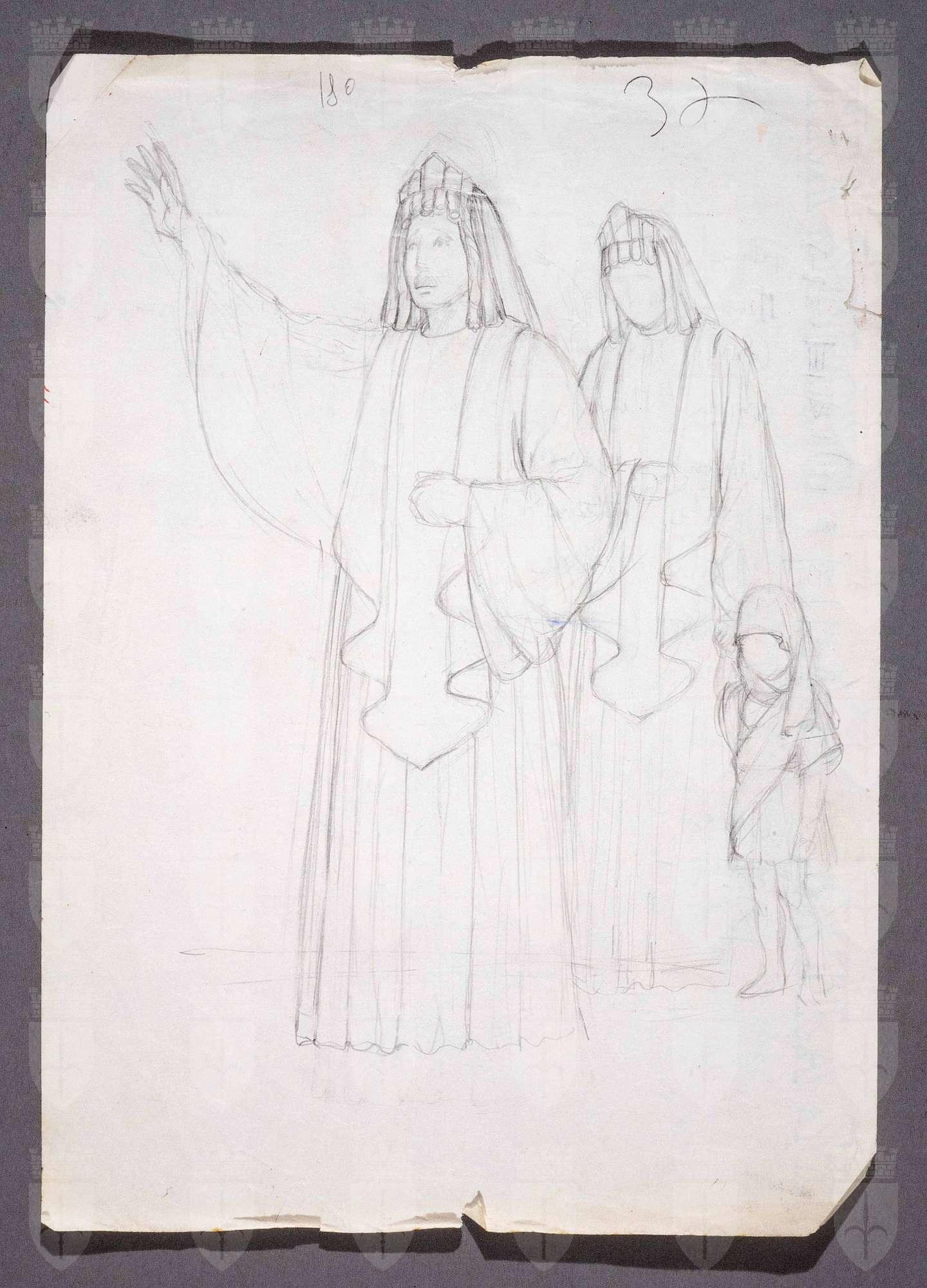 Coriolano, tragedia di William Shakespeare. Gruppo di figure togate e un bambino, leggermente di tre quarti verso sinistra