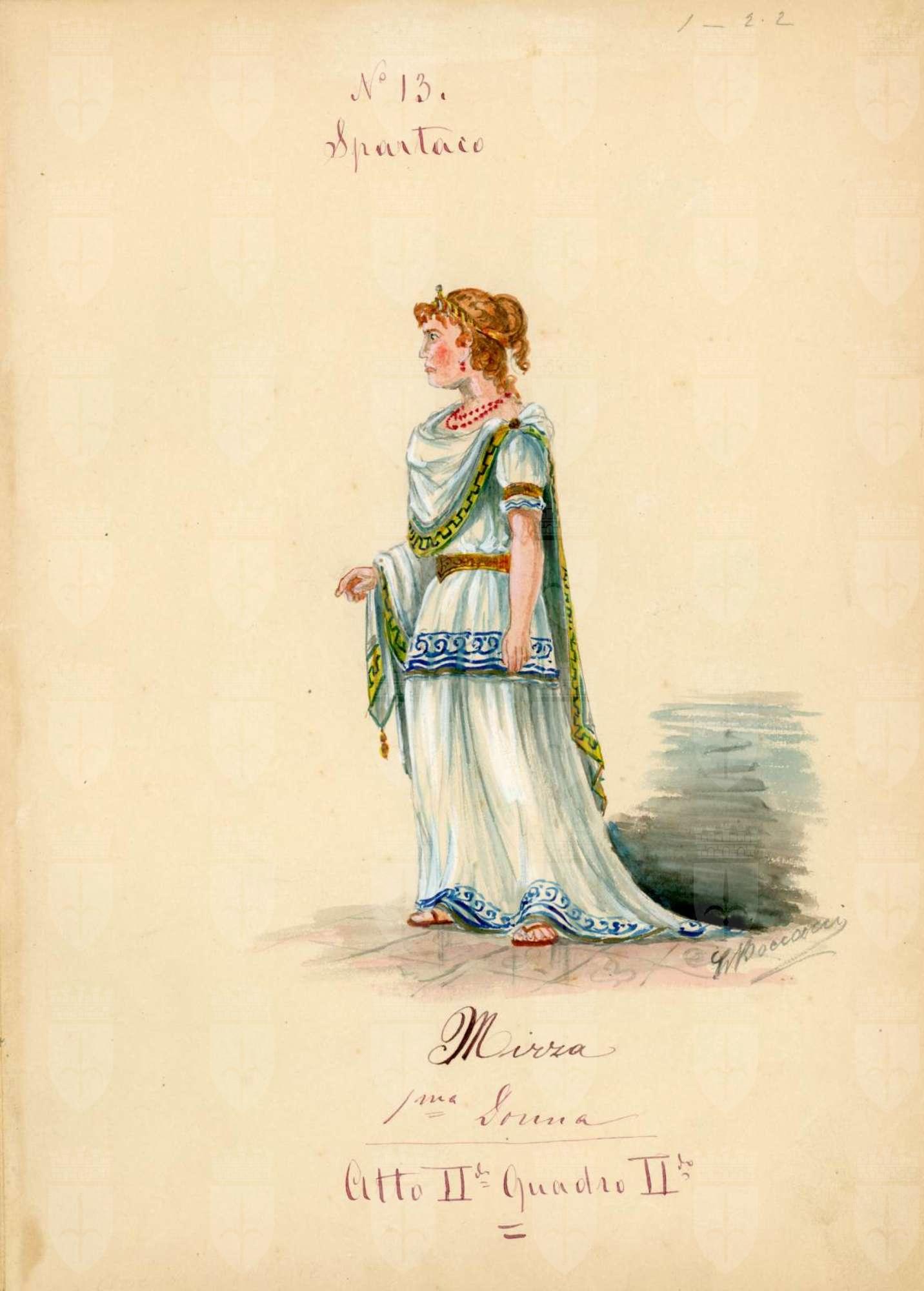 Spartaco, opera di Giuseppe Sinico. Figurino per il personaggio Mirza. Figura femminile intera di profilo. Tunica lunga bianca con decori blu sui bordi. Mantello bianco con decori gialli/blu agli orli. Collana rossa, diadema