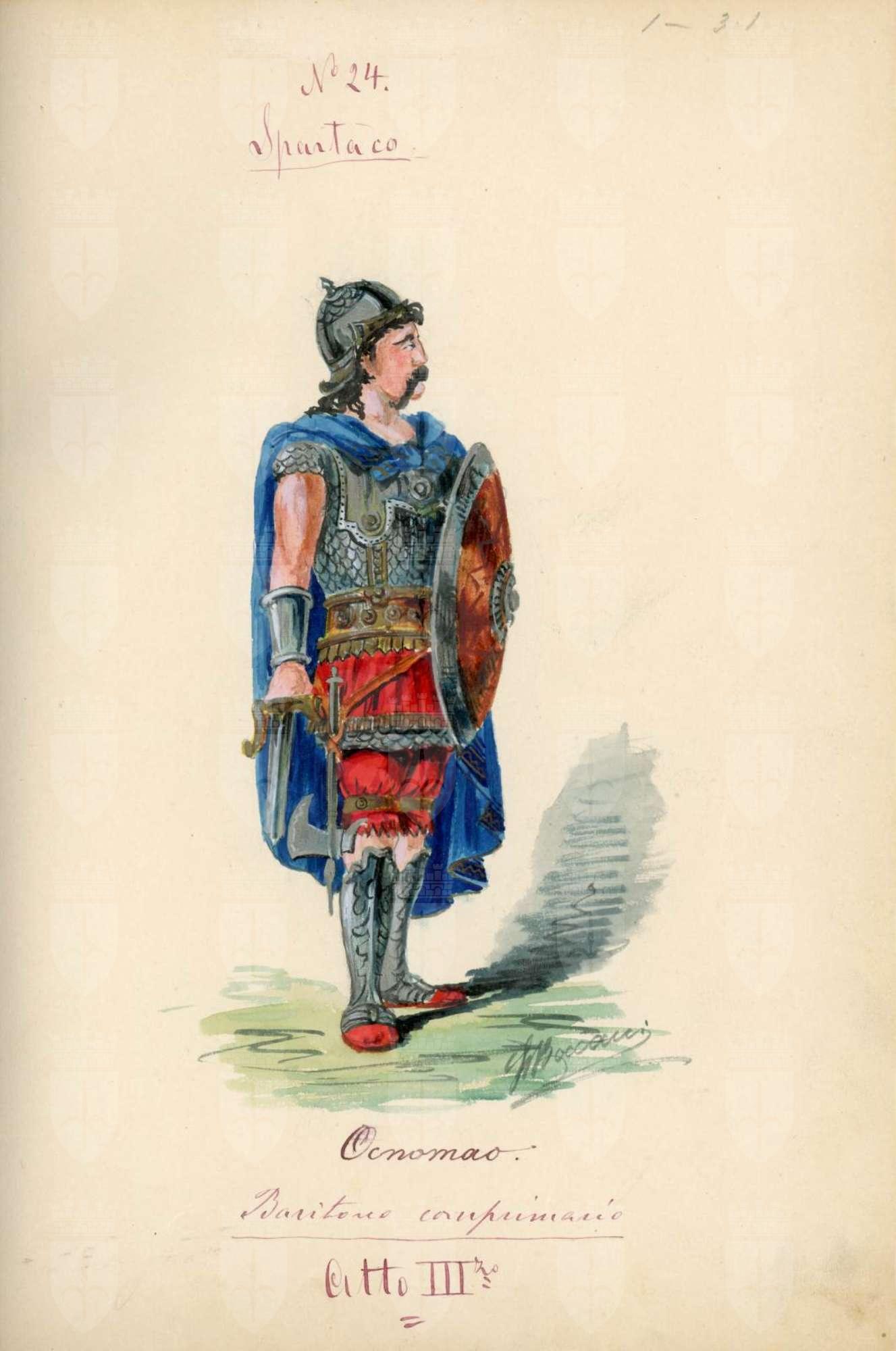 Spartaco, opera di Giuseppe Sinico. Figurino per il personaggio Enomao. Figura maschile intera con il volto di profilo, in abbigliamento militare. Tunica corta e calzoni rossi al ginocchio, corazza a squame, mantello turchese scuro, schinieri, gladio nella mano destra, scudo nella sinistra