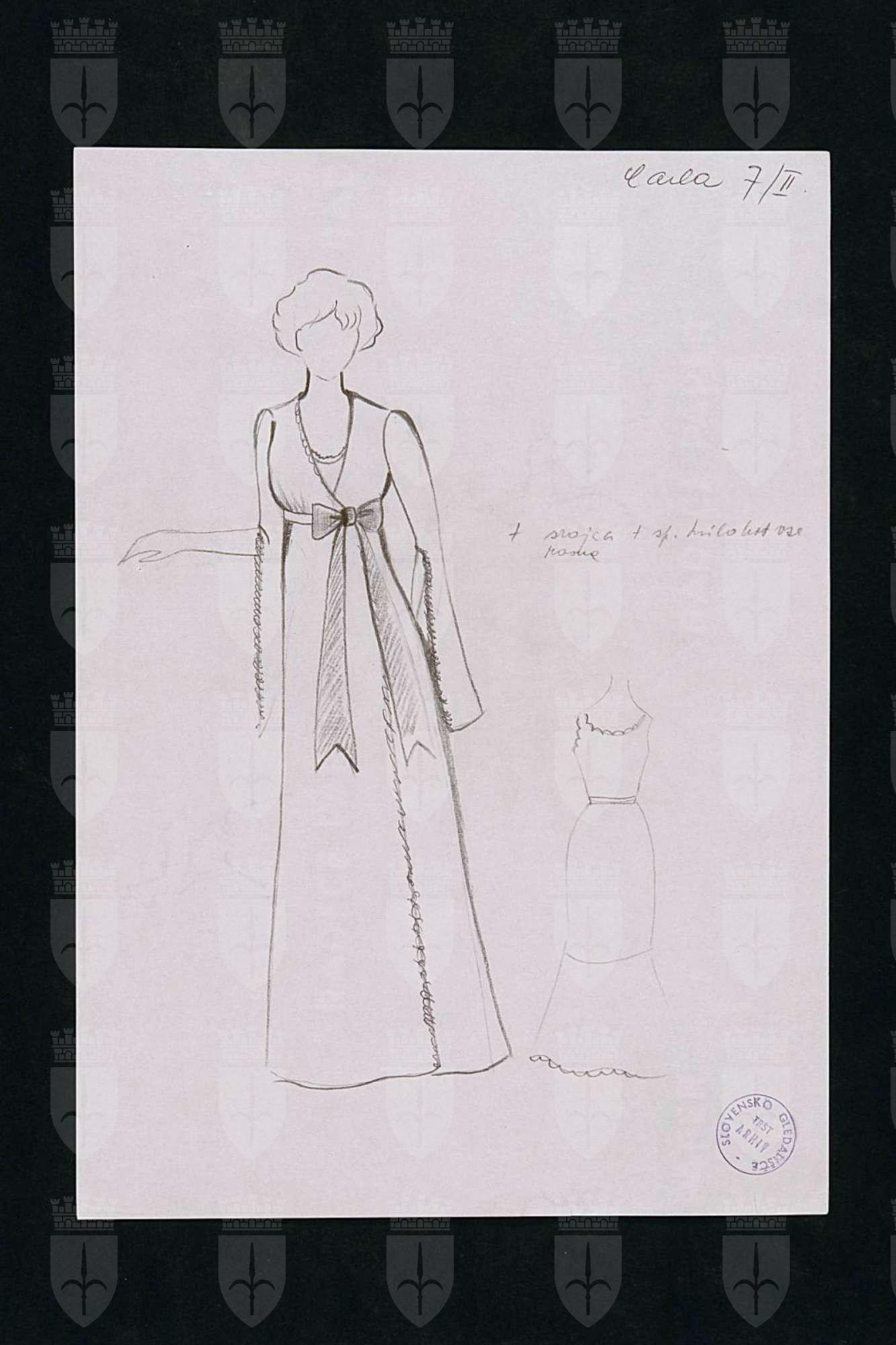 La coscienza di Zeno (Zenova Izpoved), di Italo Svevo nel rifacimento scenico di Tullio Kezich. Costume per Carla, figura femminile intera, abito da camera chiuso a portafoglio, fiocco in vita