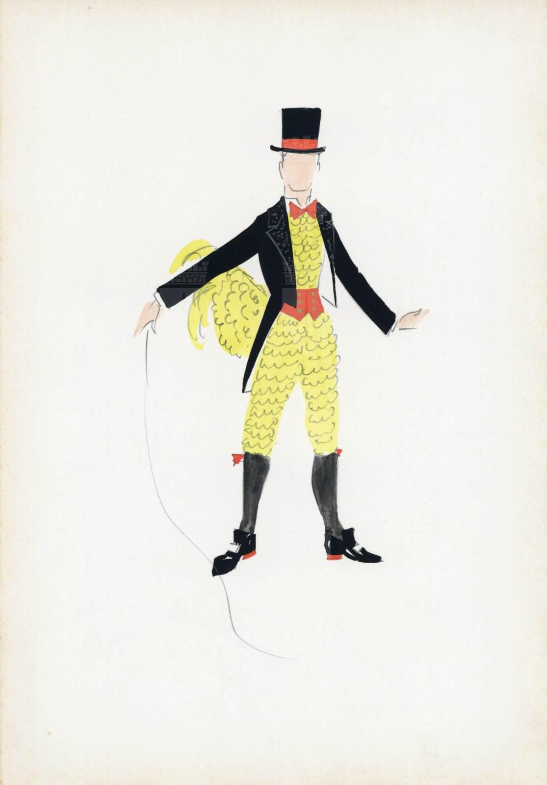 La donna perduta, operetta di Giuseppe Pietri, costume per ballerino-gallo, ambientazione caffè concerto. Indossa una tuta gialla in gale di pizzo sovrapposte, giacca nera, calzettoni neri con fiocchi rossi, scarpe con fibbia, vistosa coda di gallo, papillon rosso, frusta, marsina, cappello a cilindro con nastro rosso