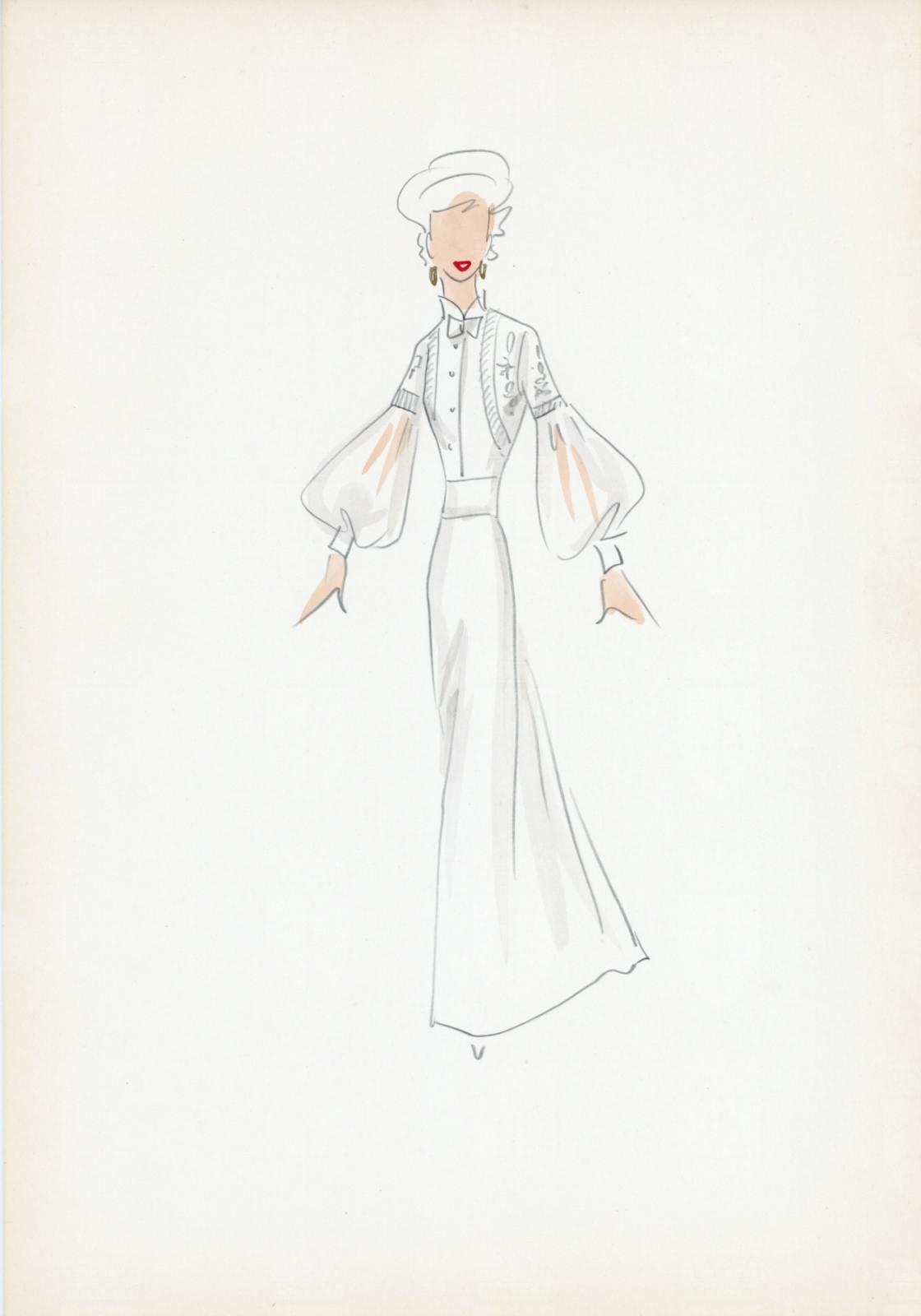Sogno di un valzer, operetta di Oskar Strauss, costume femminile bianco da giorno, camicia accollata con maniche ampie a palloncino e trasparenti, giacchino sovrapposto, gonna svasata lunga, cappello, orecchini, fiocchetto al collo