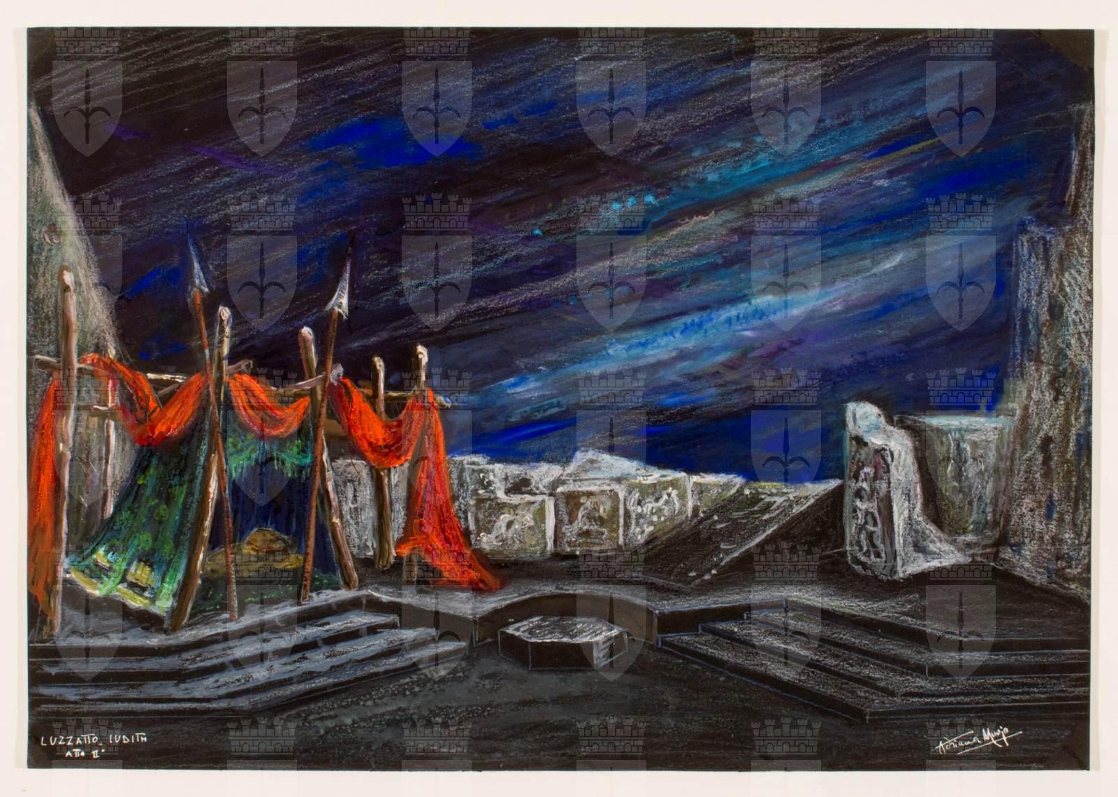 Judith, dramma biblico di Livio Luzzatto, atto 2. Accampamento assiro. Terrapieno con pedana a scivolo e due scale laterali. Tenda supportata da traliccio ligneo, due lance e drappo rosso