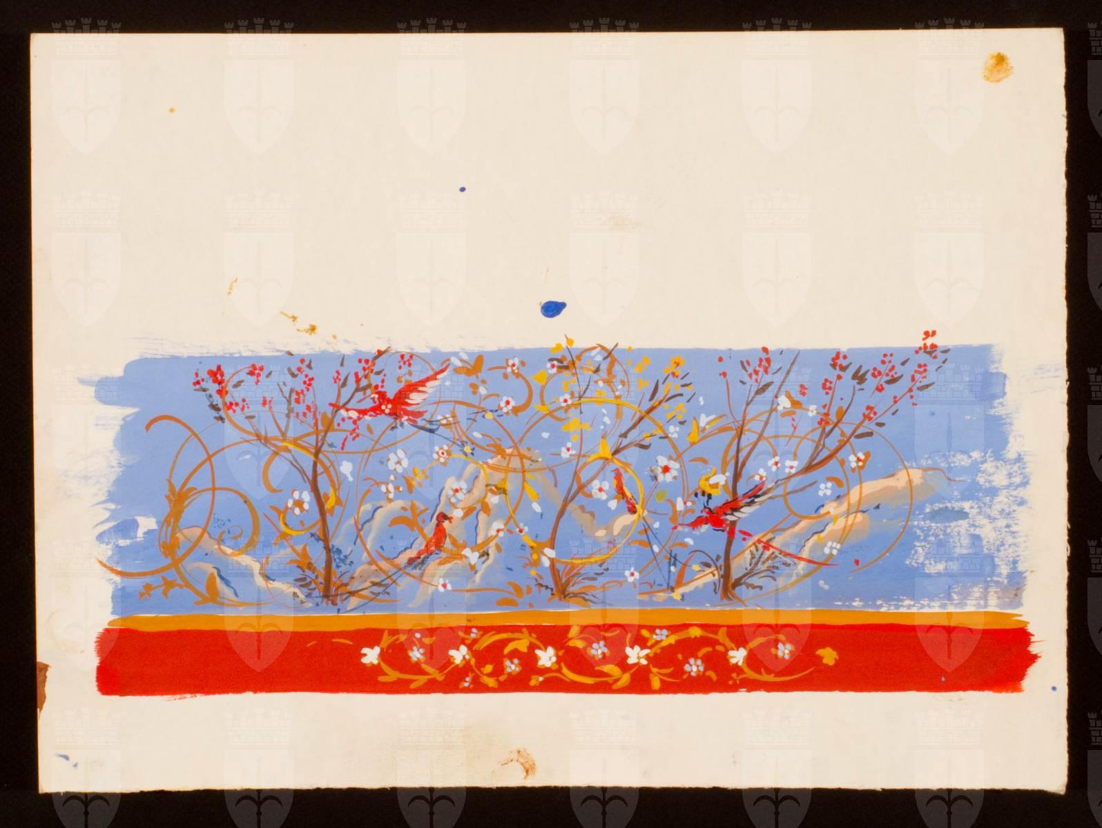 Il gallo d'oro, opera fiaba di Nikolaj Rimskij-Korsakov, dettagli preparatori. Striscia decorativa a tre colori con motivi ornamentali e montagne sullo sfondo