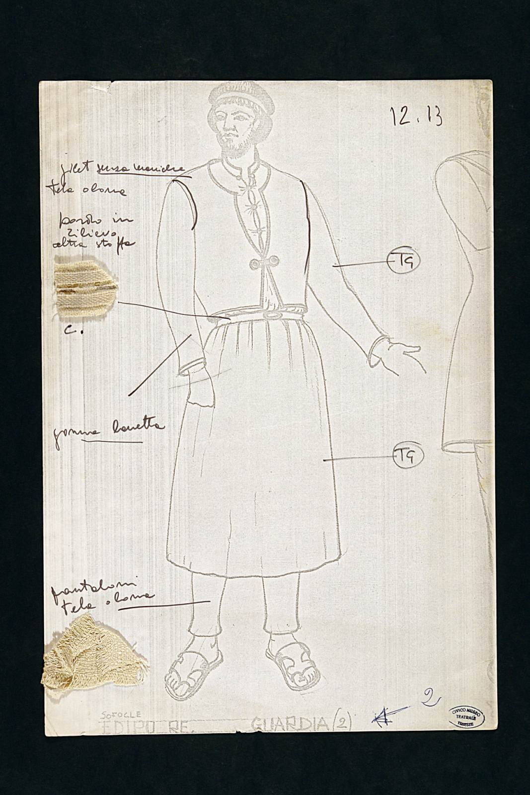 Edipo Re di Sofocle, figura maschile intera, indossa fascia frontale, abito a abbottonatura centrale con cintura al polpaccio, pantaloni alla caviglia, sandali a destra, sul bordo sinistro sezione di bozzetto
