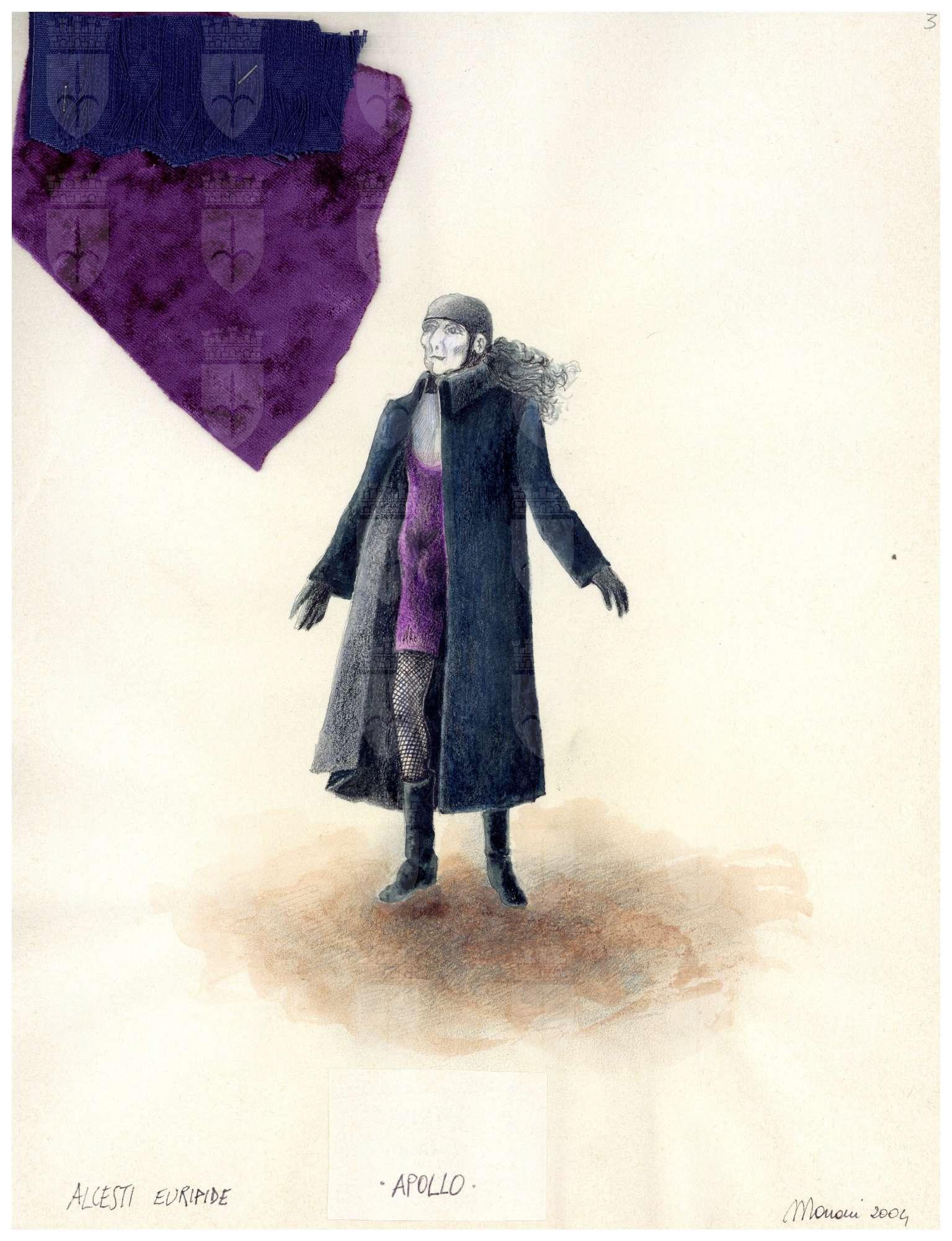 Alcesti di Euripide. Personaggio: Apollo. Indossa un abito tubino corto viola, calze a rete, stivali a mezzo polpaccio, cappotto lungoviola più scuro, una cuffietta a fare da elmo in testa, capelli lunghi e ricci