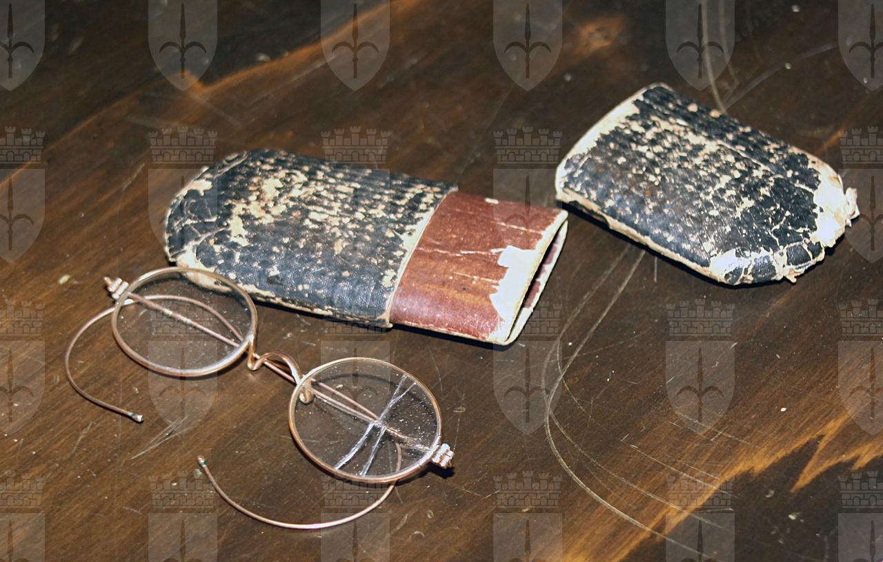 Si tratta di un paio di occhiali con la montatura in metallo con la lente di sinistra incrinata, conservati in una custodia di cartone marrone costituita da due parti.