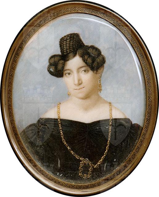 Ovale con ritratto femminile a mezzo busto. La donna raffigurata en face veste un abito di velluto scuro con ampia scollatura ovale, corpetto attillato, reso tale dall'utilizzo del busto, stretto all'altezza della vita da una cintura in tinta con l'abito e dotata di una fibbia dorata. Attorno al collo la donna porta una preziosa collana, mentre ai lobi vi sono degli orecchini; acconciatura a giraffa.