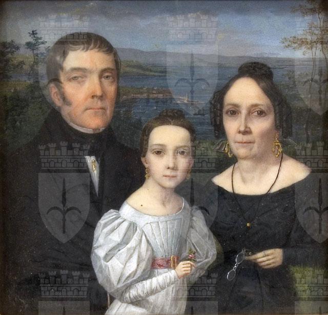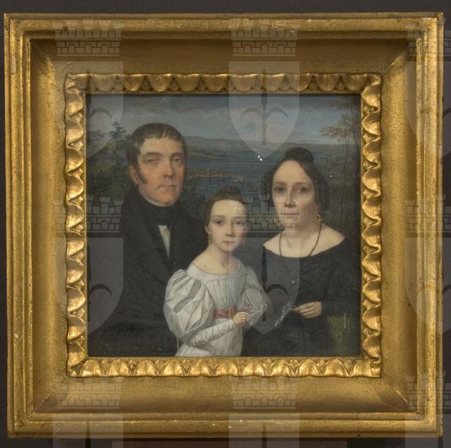 Acquistata da Giorgio Demarchi nel novembre 1931, la miniatura ritrae la famiglia tedesca Schatz, effigiata con il Golfo di Trieste sullo sfondo. Secondo quanto riporta la scheda inventariale del museo, la miniatura reca sul verso l'iscrizione: ottobre 1834, che non è stato possibile verificare direttamente. La miniatura appare condotta da un pittore attento alla resa del vero, che non esita a indugiare sul volto, non più giovane, della donna a destra, ma leggermente impacciato nella figura della fanciulla, che mostra evidenti sproporzioni nel corpo. Da mettere in relazione con le miniature 13/2512 e 13/2556, che verosimilmente raffigurano in età giovanile i due coniugi qui effigiati.