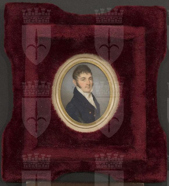 Ritratto in miniatura di formato ovale inserito in una cornice sagomata e foderata di velluto rosso. L’uomo è ritratto a mezzo busto, con il busto volto verso destra; indossa una giacca blu con bottoni dorati, su un gilet e camicia, dal colletto rialzato, candidi, come la cravatta, avvolta intorno al collo.