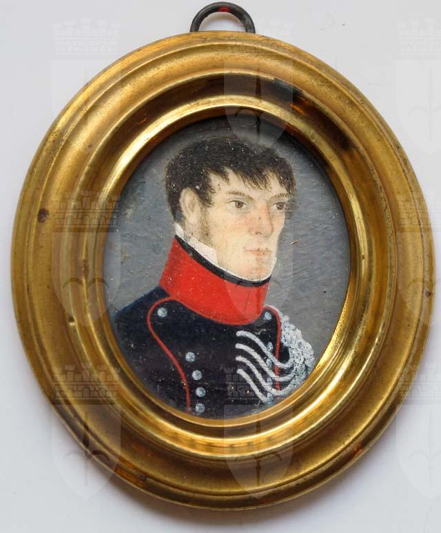 La miniatura, pervenuta nelle collezioni civiche nel 1900 attraverso il legato Carlo Zanella, ritrae un ufficiale dell’esercito, che indossa una giacca blu scuro, con pettiglia bordata di rosso, come il colletto rigido, e bottoni argento come i cordoni.