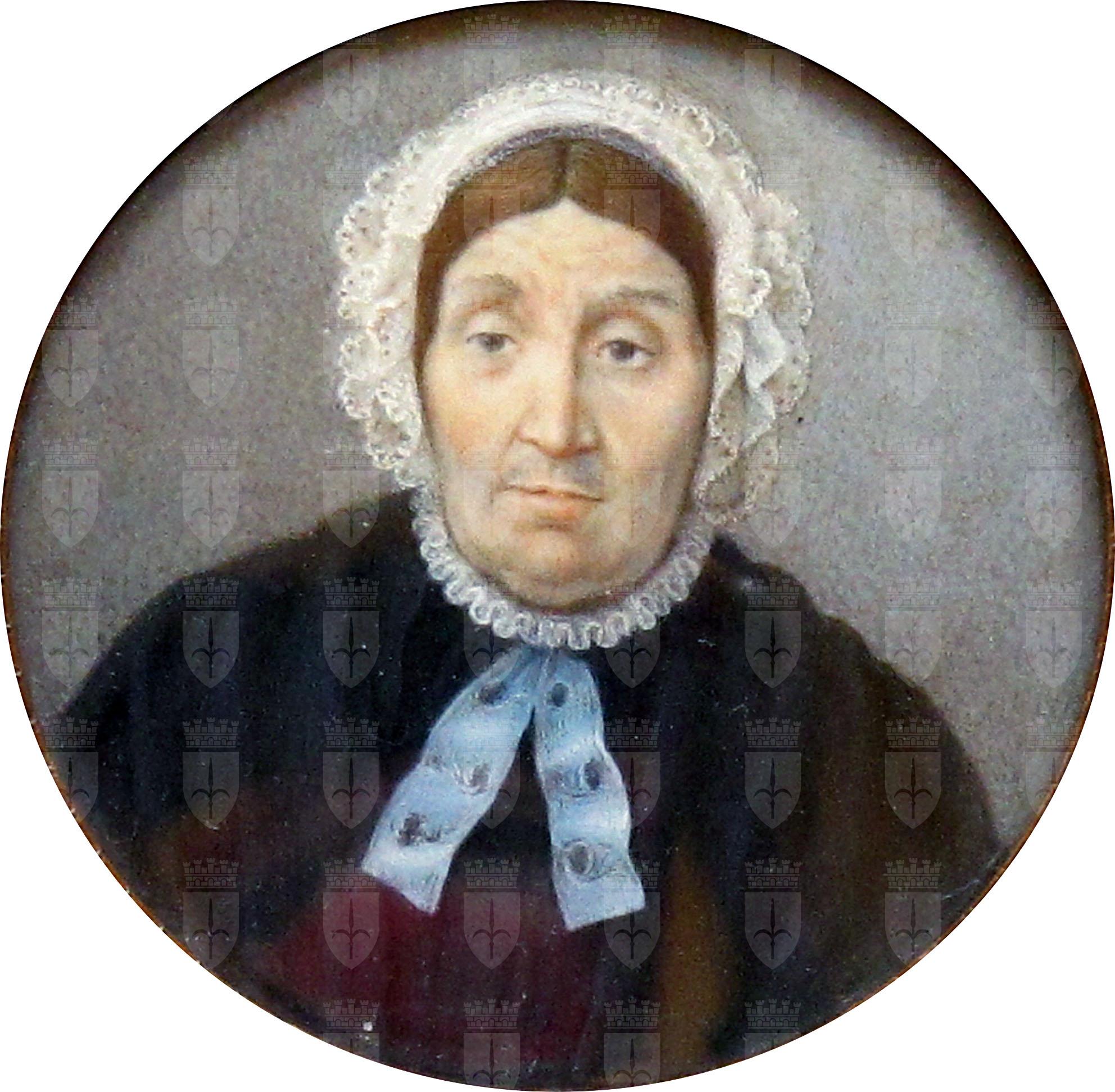 Contro un fondo grigio è ritratta frontalmente una donna, non più giovane, che indossa un abito scuro accollato; il volto, incorniciato da una cuffia allacciata sotto il collo, segnato da rughe, mentre lo sguardo è volto verso l’esterno.