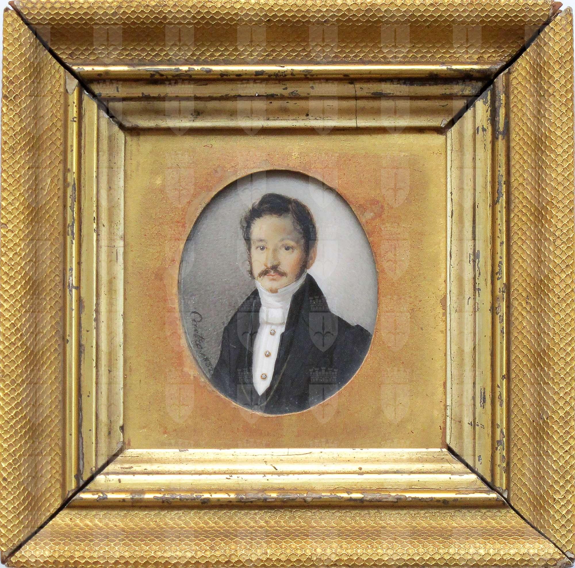 Dipinto in miniatura di forma ovale raffigurante ritratto maschile a mezza figura. L’uomo, lievemente orientato verso sinistra, ma con lo sguardo verso l’osservatore, indossa giacca e panciotto neri, che contrastano con la cravatta e la camicia bianche, su cui è appuntato un gioiello.
