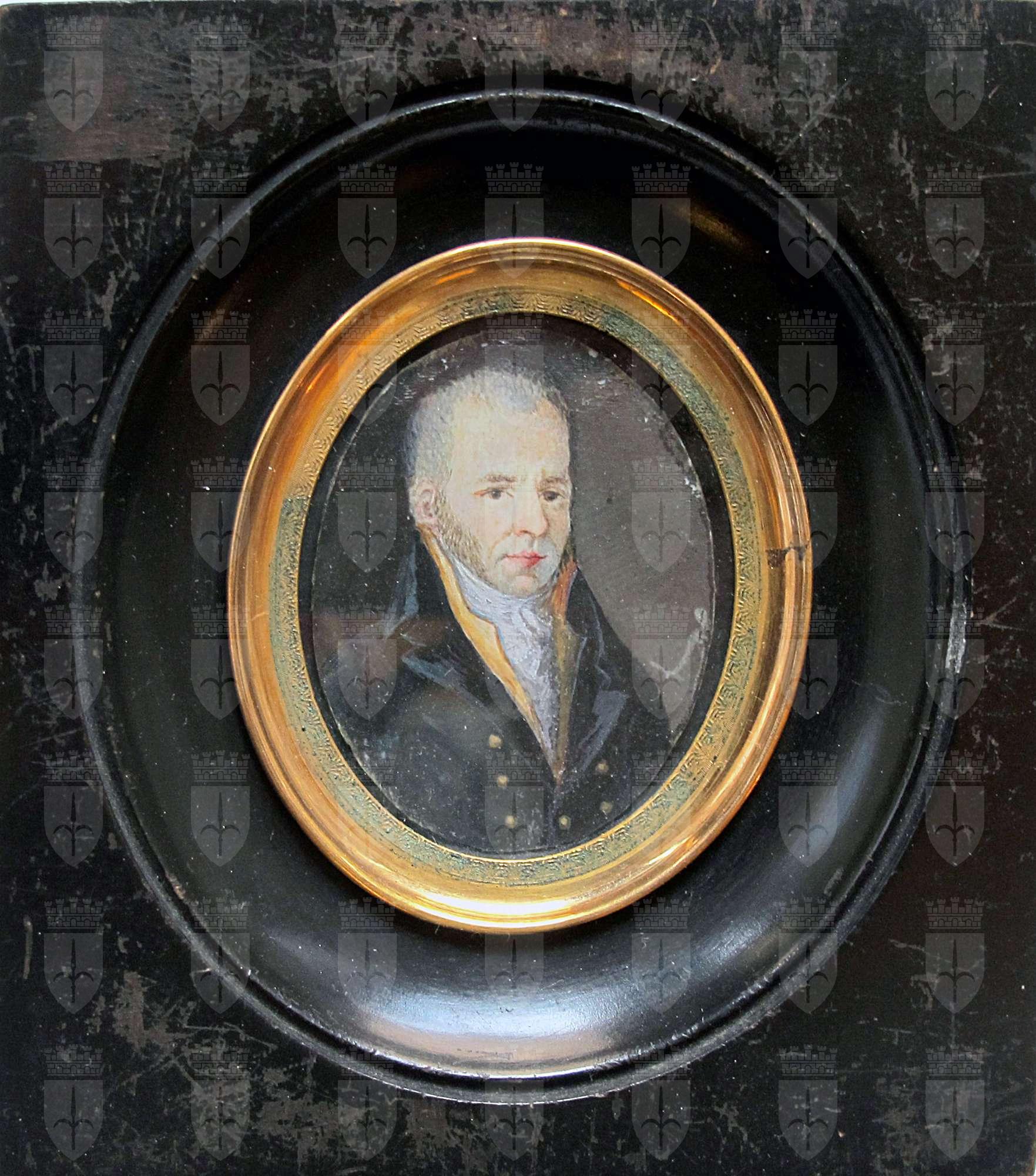 Ritratto in miniatura di formato ovale inserito in una cornice in legno, con sagomatura in metallo al centro; uomo a mezzo busto, lievemente volto verso destra, vestito di marsina scura, panciotto ocra su camicia bianca.