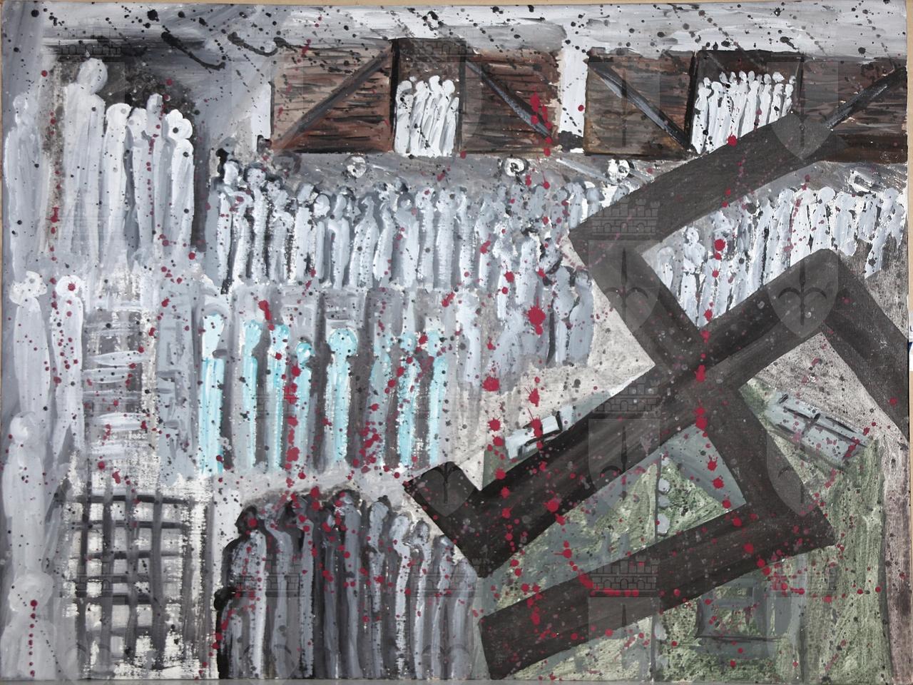 Il lavoro presenta una croce uncinata nera sulla destra, che in parte rimane fuori dalla tela. Sullo sfondo un contesto di prigionia: in alto due vagoni di un treno in cui si vedono molte figure; al centro e a sinistra ancora figure e in basso a sinistra sbarre grigie. Le figure sono estremamente stilizzate e dipinte con colori chiari, grigio e azzurro, fatta eccezione per quelle in basso di un grigio più scuro. Su tutta la tela schizzi di colore, nero soprattutto in alto e rosso scuro.