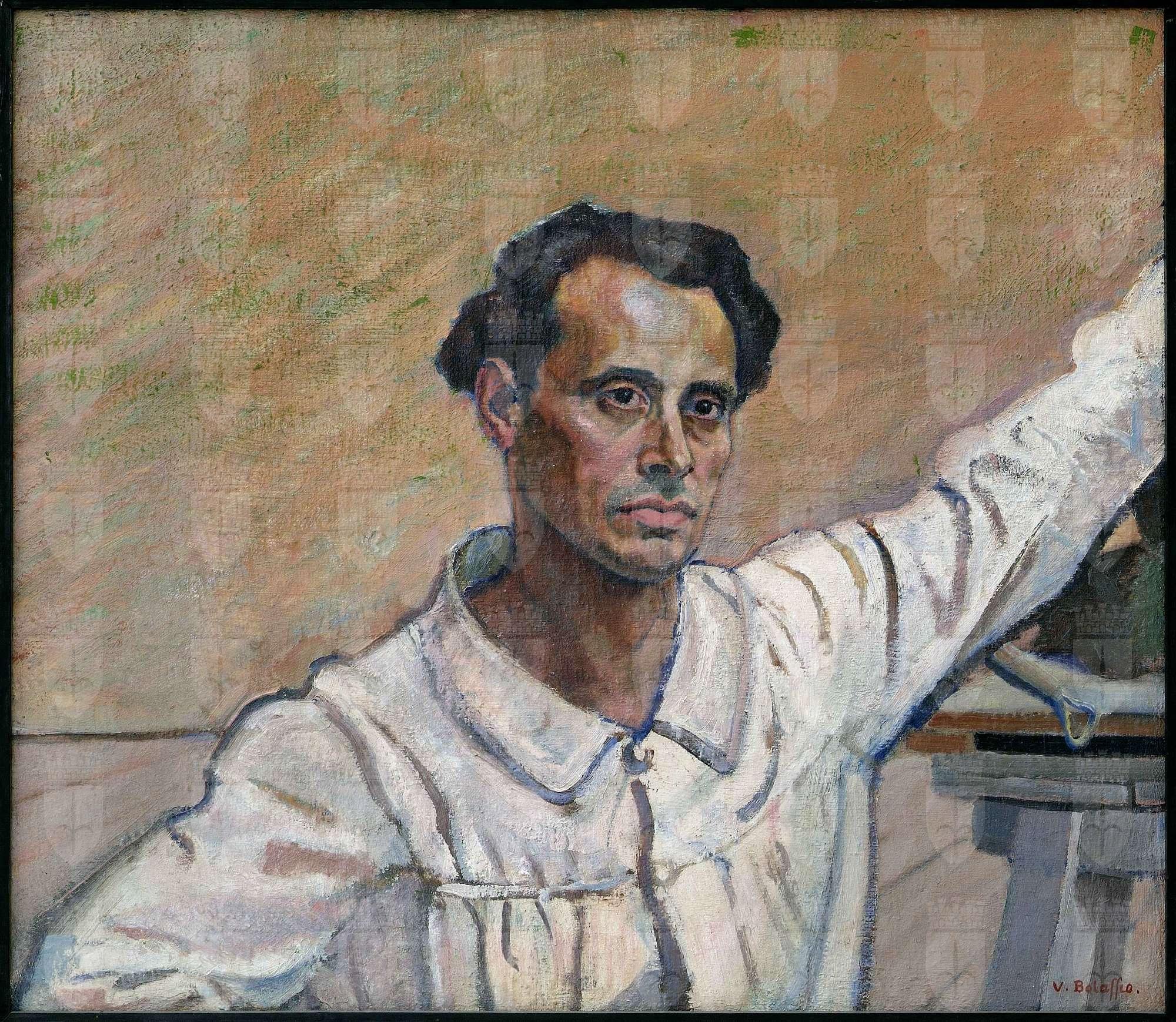 Testimonianza della profonda amicizia tra Vittorio Bolaffio - che nel 1921 si era appena trasferito da Gorizia a Trieste - e Ruggero Rovan, il dipinto appartiene alla ventina di ritratti composti dall'artista goriziano e immortala l'amico scultore in abito "da studio" durante una pausa di lavoro, in piedi, con un braccio alzato per appoggiarsi al muro. Dal punto di vista stilistico è "la più cezanniana tra le composizioni di Bolaffio ... impostata su una diagonale ... che enfatizza l'inclinazione del capo verso sinistra" (Maria Masau Dan, Il museo Revoltella di Trieste, 2004, p. 118)