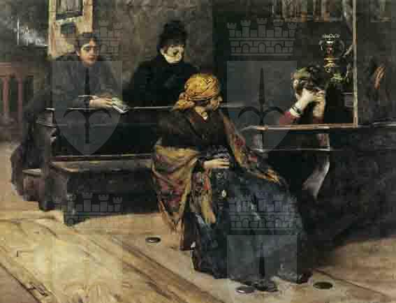 Tanto la critica d'epoca (Centelli, 1896-1897; Marasso, 1902) che quella più recente (Caramel, 1985), hanno riconosciuto nel dipinto uno dei primi frutti della volontà dell'artista di superare la pittura di genere aneddotica- legata al modello favrettiano, che aveva caratterizzato il primo periodo della sua produzione- nella ricerca di "un'arte fatta più di pensiero e di sentimento che di qualità appariscenti" (Centelli, 1896-97, p.358), capace "di suggerirci un'idea, di darci una commozione mediante la rappresentazione del vero" (Marasso, 1902, p.19). Tale processo di affrancamento, preannunciatosi sporadicamente in quadri precedenti, porterà ad esiti compiutamente simbolisti in dipinti della fine del secolo: da “Parabola” a “Fioritura nova” a “Ninfea”, esposti alle prime Biennali veneziane rispettivamente nel 1895, nel 1897 e nel 1899 (gli ultimi due conservati a Ca' Pesaro, Venezia). Nella tela qui esaminata si è rivelato in varia misura il permanere di un ancora forte legame col realismo. Se per Marasso (1902, p. 19) "tutti i particolari considerati isolatamente sono meramente realistici, ma il dramma di passione aleggia in quella navata di chiesa", Caramel, sottolineando, che "Pennellata, colore e impianto prospettico erano [...] quelli delle precedenti tele di genere", trova "rilevantissimo" "l'appesantimento della minuzia descrittiva [..]particolarmente nella popolana in primo piano" (1985, s.p.), "il cui interesse non è finalizzato alla preghiera bensì al braccialetto della ragazza che le sta a fianco" (Palazzi, 1987-88, p.150), "come un mercante di cavalli guardaun magnifico puledro sul quale si puè tentare un grosso affare" (Chiratani, 1889, p. 257). Si è ritenuto perciò che tale figura di popolana producesse con la sua aria "indifferente, pettegola, chiacchierona [...] volgaroccia anziché no [...] una troppo forte e quindi stonata nota comica in una affettuosa e delicata scena di dramma" (Munaro, 1887, p.210). D'altre parte, proprio nel contrasto fra le due figure in prma fila risiede principalmente il tono espressivo del quadro. Se le quattro fronti femminili ( a voler tralasciare una quinta donna quasi nascosta dal crocifisso) raccontano storie e stati d'animo differenti, quelle delle due "protagoniste" in particolare, coperte da un fazzoletto a tinte vivaci nell'una e dalle mani disperatamente intrecciate nell'altra, in abbinamento con l'ottusa curiosità della prima ( oltre tutto poco devotamente piazzata sull' antica lastra tombale) e col profondo raccoglimento della seconda, producono un effetto volutamente stridente, che aumenta la solitudine della figura dolente.
