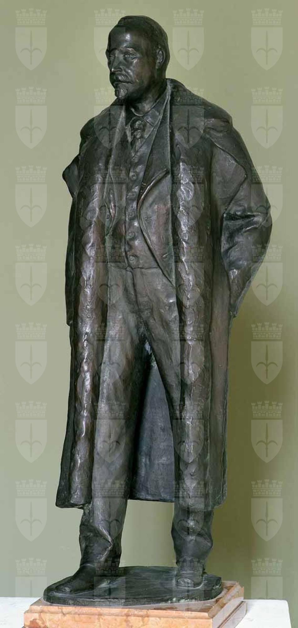 Il ritratto del barone Rosario Currò, primogenito di Rosario Currò “senior”, nato ad Acireale e deceduto a Trieste nel 1887, fa parte della ricca e preziosa donazione da lui stesso concessa al Museo Revoltella nel 1929 (e unitamente ai Civici Musei di Storia ed Arte), che comprendeva ventisei pezzi tra dipinti e sculture dell’Ottocento e primo Novecento di artisti per lo più italiani di una certa notorietà (Domenico Morelli, Leonardo Bazzaro, Andrea Malfatti e altri ancora) e di diversi artisti locali (Cesare Dell’Acqua, Umberto Veruda, Alfredo Tominz ed altri). Il padre del donatore effigiato, il barone Rosario Currò, insignito del titolo di barone da re Umberto, era un importante commerciante in agrumi e rappresentante a Trieste della Navigazione generale italiana di Genova, dove si era trasferito il fratello Antonio (Millo 1989). Nel ritratto in bronzo di Rosario junior, raffigurato all’età di 53 anni, sorprende l’estrema naturalezza della posa a figura intera, che conferisce all’immagine del noto collezionista una vibrante vitalità.