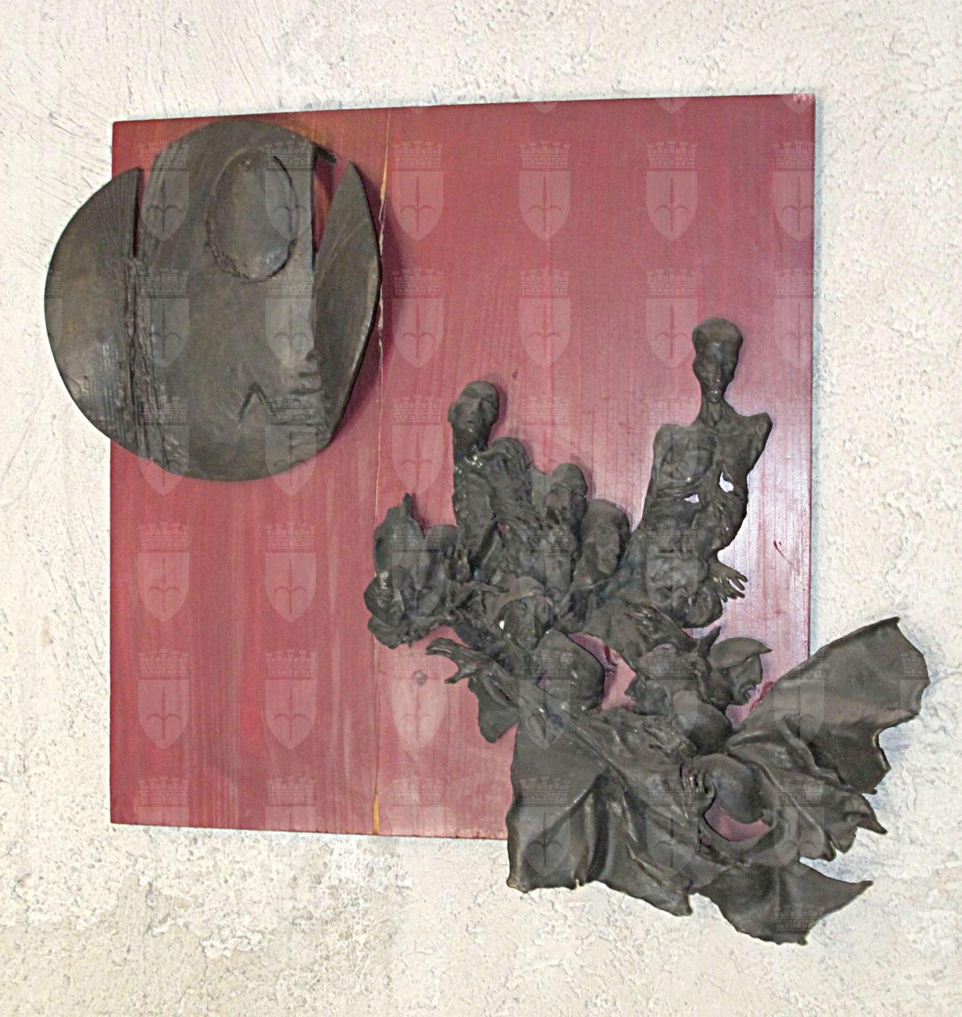 Su un pannello quadrato in legno sono applicati degli elementi in bronzo, figure e oggetti, in particolare in basso a destra scene di prigionia.