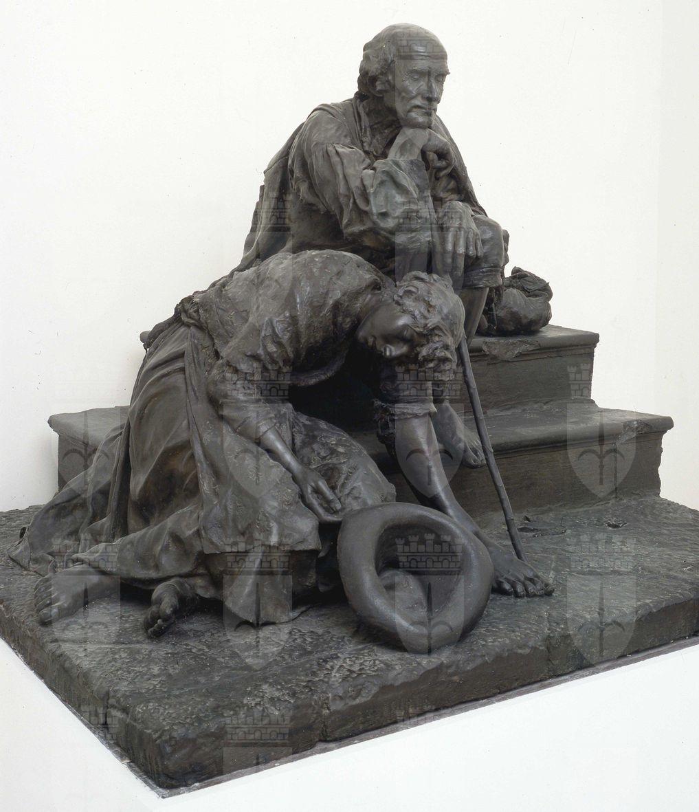 La complessa trattativa per l’acquisto del grande gruppo scultoreo in gesso dipinto è documentata nei verbali del Curatorio dell’epoca e negli scambi epistolari conservati in archivio ed attesta il valore dell’acquisizione di un’opera di elevata qualità e significato. Realizzata dallo scultore veneziano per una versione finale in bronzo, mai eseguita, la scultura fu molto apprezzata e premiata con medaglia d’oro all’Esposizione Nazionale di Venezia del 1887 e all’Esposizione Internazionale di Monaco di Baviera del 1888. "Belisario", trasposizione in età moderna di un personaggio realmente esistito e identificato nel noto generale Flavio Belisario, che nel VI d.C. operò al fianco dell’imperatore Giustiniano affrontando con successo diverse orde barbariche, veste perciò i panni di un combattente d’epoca risorgimentale, ridotto in povertà a causa dei gravi dissesti economici dell’Italia postunitaria, incapace di offrire un sostentamento ai reduci di guerra. L’attenzione estrema posta dallo scultore nel definire realisticamente i dettagli, dalle medaglie appuntate sulla giacca alle rughe del volto, alla naturalezza estrema del panneggio della giovane donna ai suoi piedi, denota una eccezionale maturità artistica del suo autore, ugualmente teso a conferire all’insieme una compostezza equilibrata e suggestiva. Fu Giuseppe Caprin, tra i componenti illustri del Curatorio di quei decenni, a convincere infine la maggioranza ad acquistare l’imponente scultura per il prezzo di 2.000 Lire, evidentemente consapevole dell’importanza dell’opera e del suo artefice. Altrettanto orgoglioso di vedere rappresentata la propria opera al Museo Revoltella fu Urbano Nono, come confermato nella lettera autografa indirizzata al mediatore dell’affare, Guglielmo Guggenheim, nel marzo 1889, in cui lui stesso dichiara: «Mi sorriderebbe l’idea di vedere un mio lavoro ornamento del benemerito Istituto, decoro e vanto della colta e gentile Trieste» (CMR, Arch. Amm., 2.1889.849).