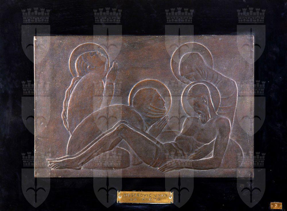 Nel 1939 Lilly e Ludmilla Kremenčič offrirono quattro bozzetti di Meštrović raffiguranti «Il pian - to delle pie donne (Deposizione di Gesù Cristo nel sepolcro) e Scena d’angeli» (in realtà Annunciazione) alla Gliptoteca di Zagabria, che non poté acquistarli per l’elevato prezzo. Per intervento del direttore della Gliptoteca, Antun Bauer (1911-2000), furono venduti ad una «famiglia amica» (CMR, Arch. Art., cartella Meštrović, Lilly e Ludmilla Kremenčič a N.N., Zaga - bria, 27 ottobre 1939). I bassorilievi, due in bronzo e due in gesso, erano stati in precedenza donati dallo stesso Meštrović allo scultore Svitoslav Peruzzi (1881-1936), che era stato suo compagno di studi all’Accademia di Vienna e successivamente suo collaboratore al Mausoleo della famiglia Račić. I due bozzetti in gesso raffiguranti il "Compianto su Cristo morto" e l’"Annunciazione" si trovano ora in collezione privata a Dubrovnik e sono datati al 1921, il bronzo con l’"Annunciazione" è di ubicazione ignota, mentre il bronzo con il "Compianto su Cristo morto" (non "La Pietà", come riportato nella targhetta) fu acquisito nel 1941 dal Museo Revoltella, mediante permuta, da Mario Coscia della Galleria d’Arte Trieste, su istanza dello scultore Marcello Mascherini (CMR, Verb. Cur., 25 gennaio 1941). Mario Coscia, a sua volta, lo aveva acquistato dal mercante d’arte Igino Calligaris (1907-1962) (CMR, Arch. Art., cartella Meštrović, Igino Calligaris a Mario Coscia, Zagabria, 3 febbraio 1941) con l’autentica di Antun Bauer redatta sulla riproduzione fotografica dell’opera (CMR, Arch. Art., cartella Meštrović, Zagabria, 1 febbraio 1941). I bassorilievi sono riferibili al Mausoleo della famiglia Račić di Cavtat, costruito da Meštrović nei pressi di Spalato tra il 1920 e il 1922 in stile art déco. Si tratta di studi per i rilievi che de - corano la campana appesa alla lanterna del mausoleo. Appartengono alla produzione religiosa incentrata sulla vita di Cristo, con cui Meštrović si confrontò per lungo tempo, e si collocano agli antipodi della sua produzione “eroica”. Il nostro "Compianto", il cui tema è eseguito con accenti espressionisti anche sul basamento dell’altare del Mausoleo, si caratterizza al contrario per un’essenziale stilizzazione che cristallizza il dolore delle pie donne, raccolte attorno al corpo di Cristo in un serrato equilibrio compositivo.