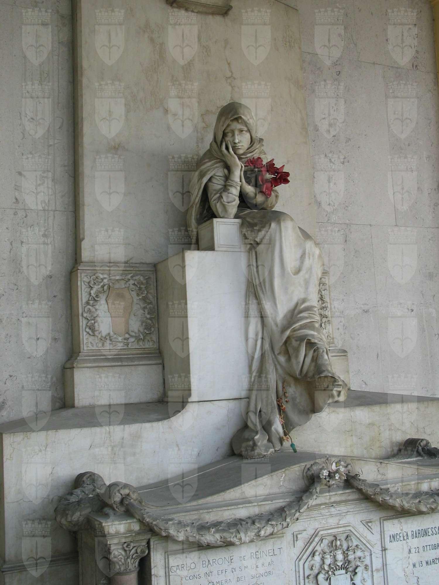 Sopra un'arca, sul cui fronte campeggia tra due iscrizioni lo stemma gentilizio, è seduta, su uno zoccolo marmoreo, una figura femminile avvolta in un lungo mantello, la guancia poggiata sconsolatamente sulla mano destra ed il gomito su di un plinto in pietra, lo sguardo perso rivolto a destra nel vuoto; alle sue spalle una stele, sulla cui sommità compare il mezzobusto del barone Carlo de Reinelt.