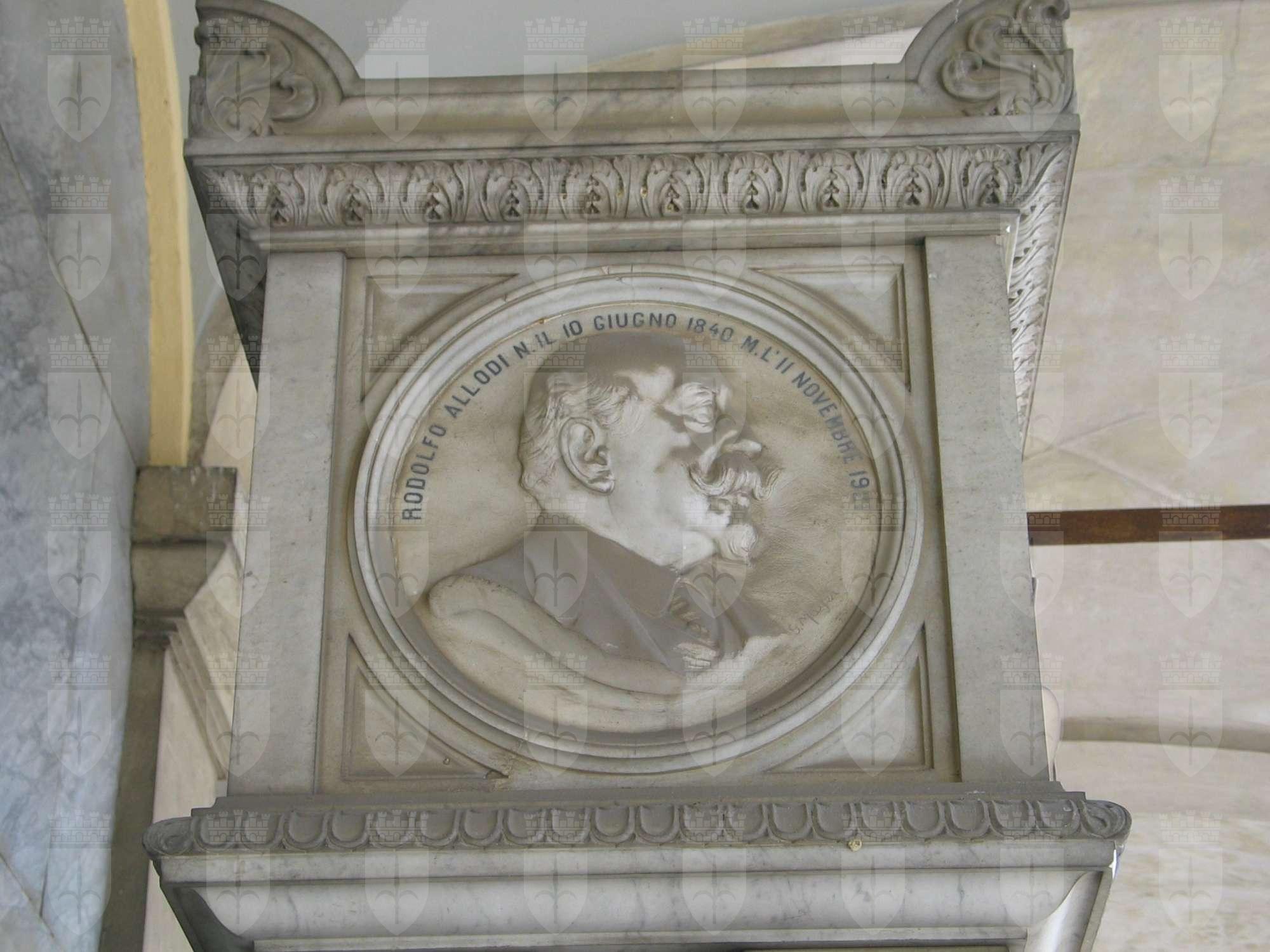 Un sarcofago poggiante su un basamento marmoreo è ornato da quattro tondi con, a bassorilievo, i ritratti dei membri della famiglia Allodi; sul fronte Giusto Giuseppe e Maria con al centro una ghirlanda di fiori, sui lati minori due ritratti maschili. Sulla destra Rodolfo Allodi e sulla sinistra Alberto Allodi.