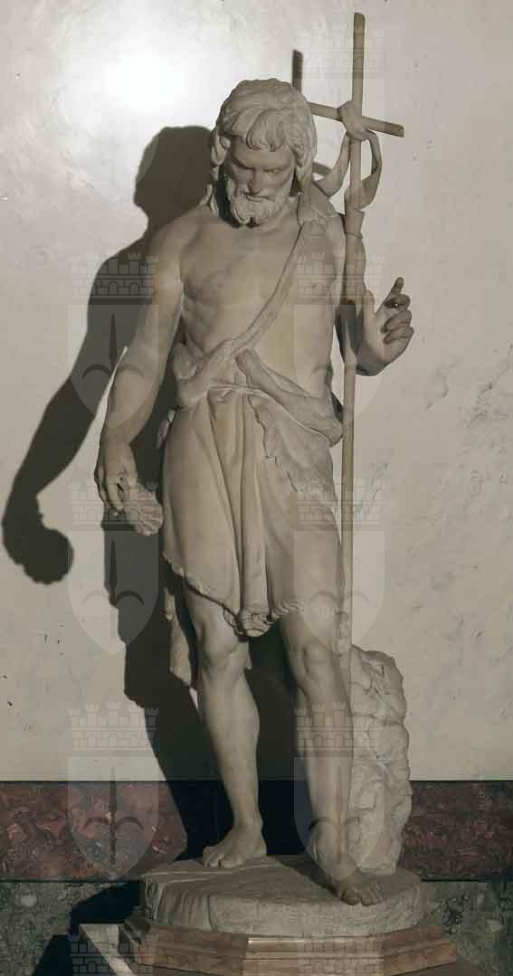 Sono inventariate nelle collezioni museali due versioni di quest’opera, una versione in marmo donata dagli eredi dell’artista nel 1955, e un bozzetto in gesso entrato a far parte delle collezioni museali dal 1873, anno in cui fu acquisito dal neocostituito Museo Revoltella. In questo caso si arrivò al risultato dopo una lunga trattativa iniziata qualche anno prima, nel 1870, quando il fratello dello scultore propose la vendita dell’opera in questione per la somma di 1000 fiorini, cifra che fu corrisposta solo in parte. Le due opere presentano delle forti analogie: è pressoché identica la figura del San Giovanni, con le medesime fattezze fisiche, con la posizione della gamba sinistra posta in avanti quasi pronta per incedere e la testa inclinata sul petto. E se nella versione in gesso il Battista è raffigurato in atto di benedire, nell’altra in marmo reca in mano una conchiglia e un bastone a croce. Firmato e datato «Roma 1855», il gesso risale al periodo in cui l’artista fu accolto nello studio del Trani nella capitale e vinse il primo premio di scultura all’Accademia di S. Luca. Tre anni dopo gli fu conferita la grande medaglia della Congregazione artistica dei Virtuosi al Pantheon mentre di ritorno a Trieste, vi aprì uno studio. Eseguì un gran numero di busti, statue allegoriche e monumenti funerari per le maggiori famiglie triestine (e resta testimonianza inoltre di richieste, soddisfatte, da Parigi e da Lubiana).