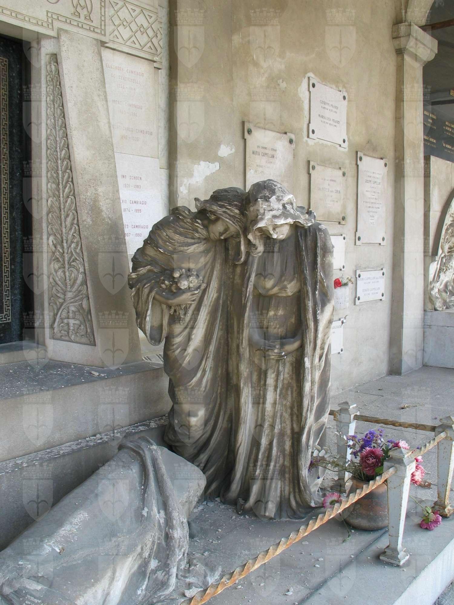Due figure femminili dolenti, avvolte in lunghi mantelli ed incappucciate, si avvicinano ad una bara appoggiata a terra e coperta da un drappo, l'una recante un mazzo di fiori, l'altra con le mani giunte; sullo sfondo, sopra uno zoccolo, è una porta bronzea fiancheggiata da due colonne in pietra che sorreggono un'architrave con il nome della famiglia; ai lati le lettere alfa ed omega, simboli del principio e della fine.