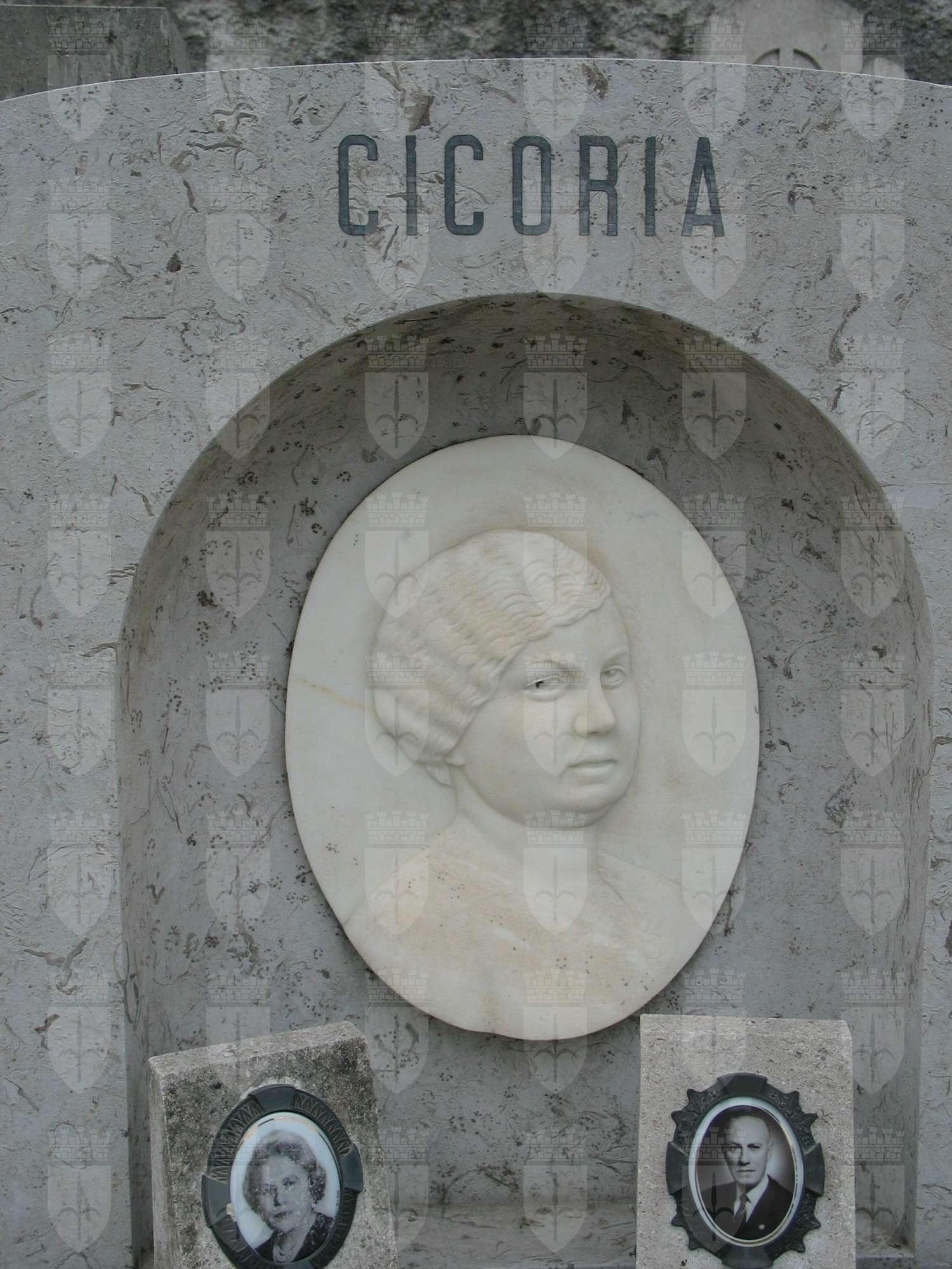 La stele è affiancata da una croce a rilievo e racchiude entro una nicchia un medaglione ovale con ritratto femminile.