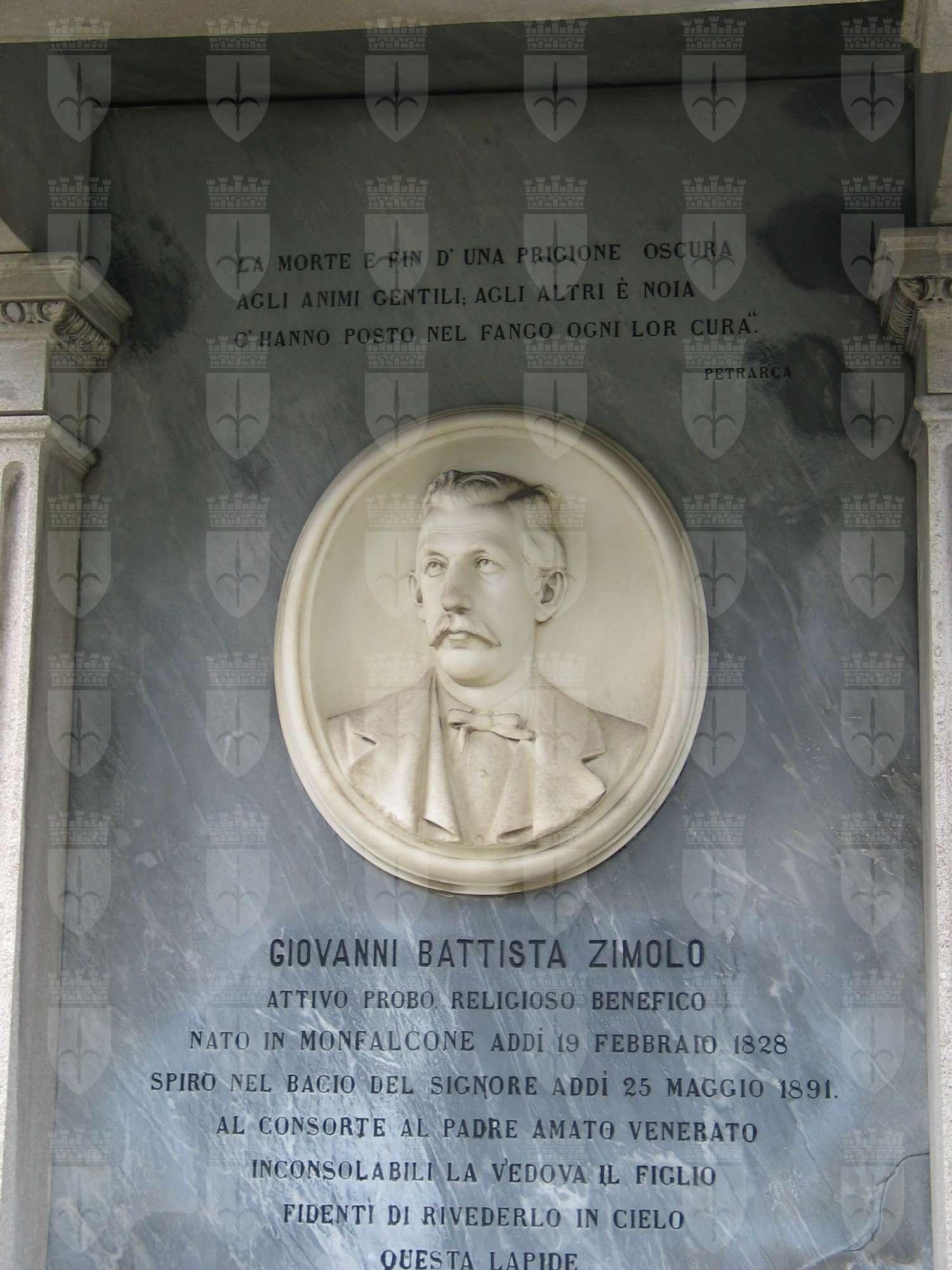 Sulla parete di fondo, rivestita da lastre di marmo, è addossata un'edicola frontonata con paraste e colonne scanalate, posta su un basamento e decorata nel timpano da un rilievo col globo alato; all'interno dell'edicola, su una lastra di marmo nero, è collocato il medaglione con il ritratto di Giovanni Battista Zimolo; sopra il basamento, in posizione centrale, è appoggiato un cuscino marmoreo decorato da un fascio di fiori a rilievo, mentre sul fronte del basamento, a destra, è una targa bronzea curvilinea con iscrizioni. L'intero monumento è circondato da una bassa cancellata in ferro battuto.