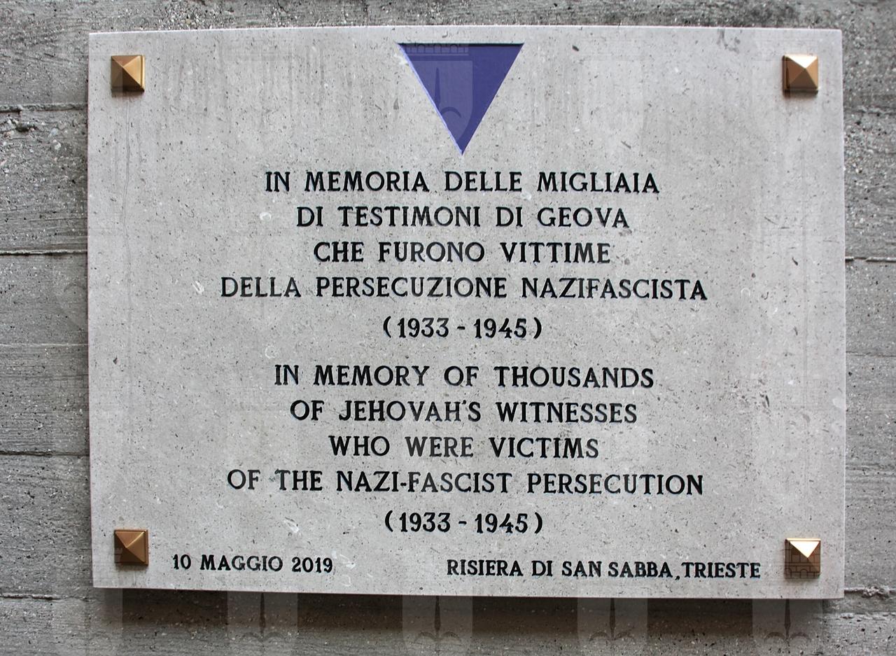 Lapide commemorativa con iscrizione, contraddistinta da un triangolo rovesciato di colore viola nella parte alta.