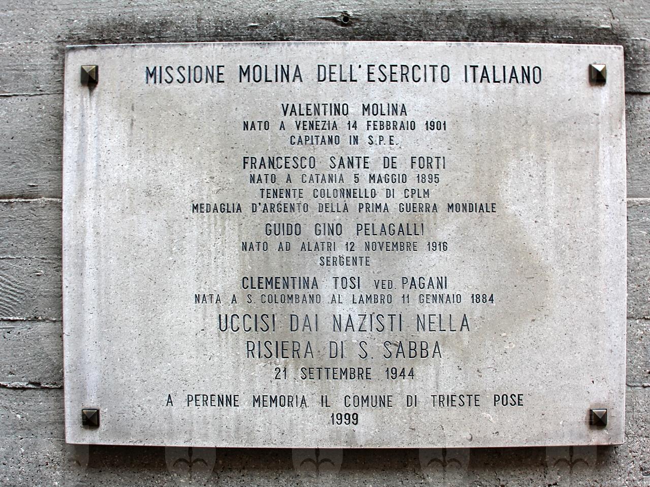 La targa ricorda i quattro caduti della missione alleata del capitano Valentino Molina: il capitano stesso, il tenente colonnello Francesco Sante De Forti, Guido Gino Pelagalli e la signora Clementina Tosi vedova Pagani, uccisi il 21 settembre 1944. La storia legata a questa vicenda riguarda la radio che trasmetteva dall'abitazione di Clementina Tosi di Trieste, in via Ireneo della Croce. La radio era stata portata a Trieste alla fine del gennaio del 1944 da Valentino Molina, capitano dei Bersaglieri e da Enzo Barzellato, radiotelegrafista della Marina. Da questa storia è tratto il libro per bambini "La trisnonna Clementina e la Risiera di San Sabba", edito a Trieste nel 2020.