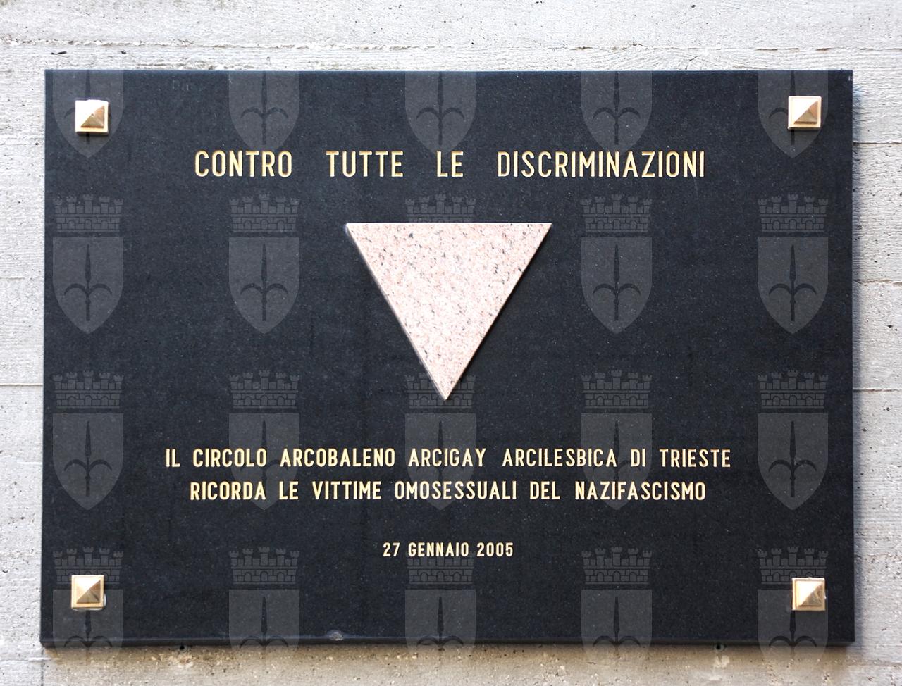 Lapide commemorativa nera con triangolo rovesciato al centro e iscrizione dorata.