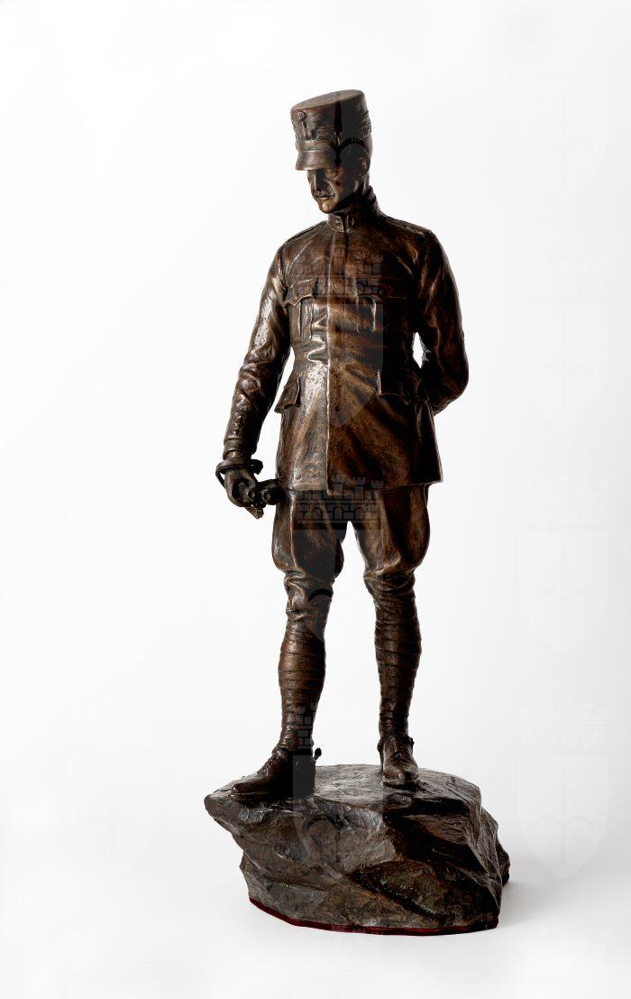 L’opera è entrata a far parte della collezione nel 1933 e poche sono le notizie a essa relative. Emanuele Filiberto di Savoia, comandante della Terza Armata, viene ritratto dallo scultore in una posa poco spontanea, probabilmente in vetta a un dirupo, con una mano dietro la schiena e con l’altra impegnato a reggere un cannocchiale. L’uniforme militare è descritta nei dettagli secondo uno stile verista mentre l’elmetto, calato sulla fronte, non nasconde uno sguardo dritto e sicuro. L’opera, di cui esistono più versioni fu eseguita probabilmente durante la prima guerra mondiale quando, nonostante i suoi sessant’anni, allo scultore fu consentito di partire come volontario per il fronte. Nonostante le difficoltà, Ximenes continuò a lavorare «nell’ampio studio di Cervignano, almeno fino a quando questo non fu smantellato dai nemici e anche dai nostri, e dove, quando più urgenti doveri glielo concedevano, egli lavorava con tranquillo entusiasmo, come fosse invece nel proprio studio di Piazza Galeno» (Fleres). A questi anni risale la conoscenza diretta del discendente della famiglia Savoia da parte dello scultore premiato dal duca con la medaglia d’argento per valide e onorevoli motivazioni: «Ximenes Ettore di Palermo, tenente di complemento, reggimento genio. Durante un violento bombardamento di grossi calibri dell’artiglieria avversaria, si recava di sua spontanea volontà al cantiere di lavoro, soggetto al tiro, e nonostante fosse stato gettato a terra dalla violenza di un colpo scoppiato a pochi passi da lui, con calma e coraggio esemplari provvedeva a far mettere al riparo gli operai sorpresi dal bombardamento, dimostrando sprezzo del pericolo ed elevatissimo sentimento del dovere. Sdraussina, 25-4-1917» (Fleres 1928). Il bronzo in questione è una delle varie opere celebrative che l’artista realizza in questi anni, come dimostrano anche i ritratti del re Vittorio, di Armando Diaz duca della Vittoria e i piccoli busti d’argento del duca e della duchessa d’Aosta, oltre a una serie di statuette raffiguranti ufficiali francesi e inglesi.