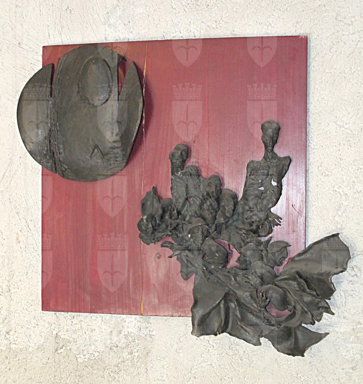 Su un pannello quadrato in legno sono applicati degli elementi in bronzo, figure e oggetti, in particolare in basso a destra scene di prigionia.