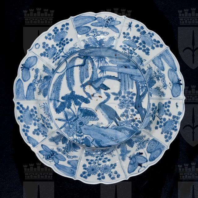 Il fondo è interamente campito con una scena raffigurante un uccello - forse una gru - su una roccia e un altro uccello - anch'esso forse una gru - in volo, sullo sfondo di uno stagno tra piante, fiori, salici, farfalle e insetti. La tesa, lievemente lobata, e il cavetto sono ripartiti in dieci segmenti, decorati con fiori, farfalle e insetti. Sul retro si trova un uccello su ramo fiorito, replicato due volte.