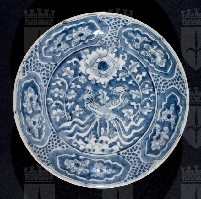 Il fondo è decorato con due fenici affrontate e incrociate, stanti sotto una grande peonia e circondate da due rami che si congiungono nella peonia stessa. Sul bordo, su uno sfondo a scaglie sono disposti cinque medaglioni lobati contenenti ciascuno due fiori. Sull'esterno, motivi vegetali stilizzati.