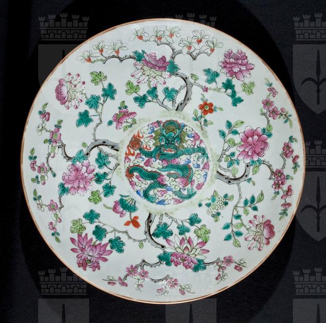 Il piatto è decorato da rami con i fiori delle quattro stagioni (peonia/primavera, loto/estate, crisantemo/autunno, pruno/inverno) che circondano un drago verde, collocato sul fondo e colto in postura frontale tra nubi rosa, mentre stringe la perla fiammeggiante (zhu).