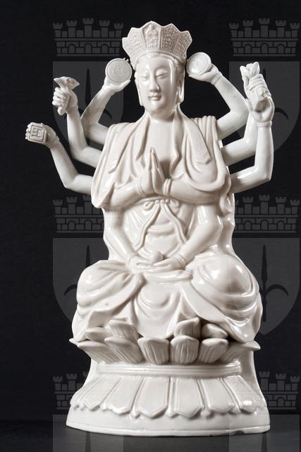 La divinità taoista Doumu, madre delle stelle dell’Orsa Maggiore, ma identificata anche con la luna, è raffigurata su un trono a forma di fiore di loto (generalmente a sua volta poggiante su un ulteriore supporto a foggia rocciosa, qui mancante). Ha la testa coronata e cinque paia di braccia e mani, di cui il principale è congiunto davanti al petto in posizione di preghiera; un altro paio riposa in grembo nell’atto di sorreggere una perla, mentre altre tre paia sono levate attorno al corpo e sorreggono numerosi attributi: con gli arti di destra (a partire dal basso) un “sigillo” con il carattere “Wang” (lett. “re”), un’elsa di spada (mancante della lama) e un disco con il carattere “Yin”; con gli arti di sinistra (a partire dal basso) un contenitore rettangolare a due manici, un elemento vegetale, un disco con il carattere “Yang”. Questa iconografia può essere sovrapposta o confusa con la dea Guanyin dalle cento mani e dai cento occhi.