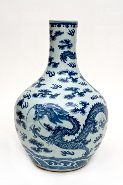 Vaso bianco e blu con decoro raffigurante una coppia di draghi affrontati, in volo tra nuvole e fiamme, colti nel tentativo di ghermire la perla fiammeggiante (zhu). La forma a corpo rotondo, quasi globulare, e collo alto e grosso, è nota comunemente come “tianqiuping”.