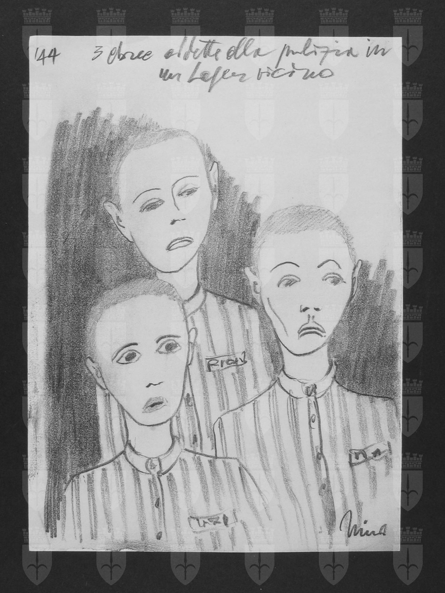 Il disegno rappresenta tre figure a mezzo busto dai volti straziati, senza capelli e con la divisa a righe su cui è appuntata una targhetta. Lo sfondo attorno alle donne è realizzato con una campitura a matita.