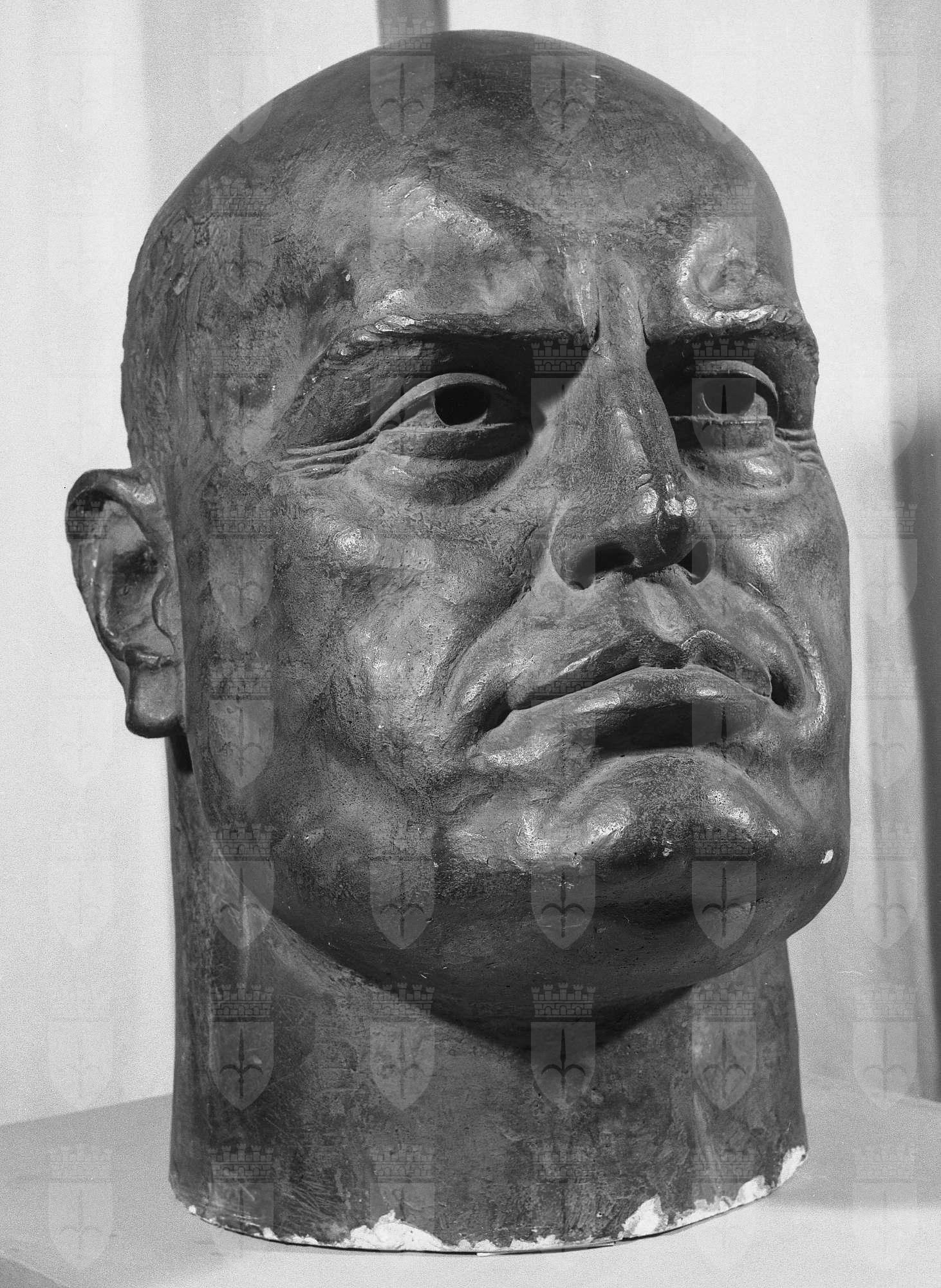 La testa di Benito Mussolini, firmata e datata «T. Russo XVII», si inserisce nel filone della ritrattistica ufficiale degli anni Venti più attenta all’idealizzazione del soggetto che alla sua resa naturalistica. Teodoro Russo sembra voler enfatizzare questi aspetti, adottando per l’opera in questione imponenti dimensioni, una posa rigidamente frontale del volto che ne accentua la simmetria e la fissità, e dei tratti fisionomici particolarmente evidenziati. Si tratta complessivamente di un soggetto ideale, concepito dall’artista sul modello della statuaria classica, espressione non tanto all’uomo fisico quanto di ciò che deve incarnare. Dagli anni Venti molti artisti si impegnarono a celebrare Mussolini sia in campo letterario, si pensi al celebre volume di Margherita Sarfatti dal titolo Dux edito nel 1926, sia in campo figurativo, come dimostra il proliferare di ritratti spesso destinati a sedi pubbliche. Tra questi ultimi si ricordi il busto commissionato dalla Sarfatti ad Adolfo Wildt nel 1923 per la Casa del Fascio di Milano. L’opera fu il primo ritratto ufficiale presentato a un’esposizione, la Biennale di Venezia del 1924; fuso in bronzo e scolpito in marmo in innumerevoli repliche, ebbe una straordinaria fortuna espositiva e divenne una icona del fascismo. Allievo di Vincenzo Gemito a Napoli, dove esordisce alla Promotrice del 1920, Teodoro Russo in quell’occasione vince una borsa di studio che gli dà la possibilità di proseguire gli studi. A Trieste arriva nel 1927 e si fa conoscere dalla critica e dal pubblico locale in occasione della prima mostra del sindacato fascista organizzata in quello stesso anno.