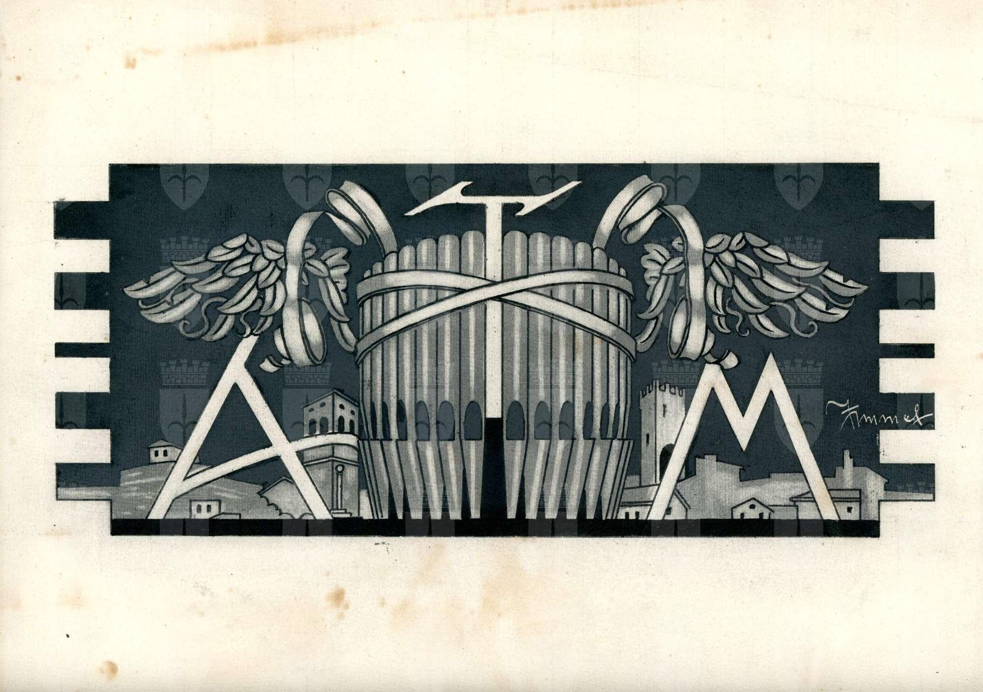 Bozzetto per decorazione di testata di giornale con fascio di canne d'organo, scorcio di Trieste con il campanile di San Giusto e le lettere ATM