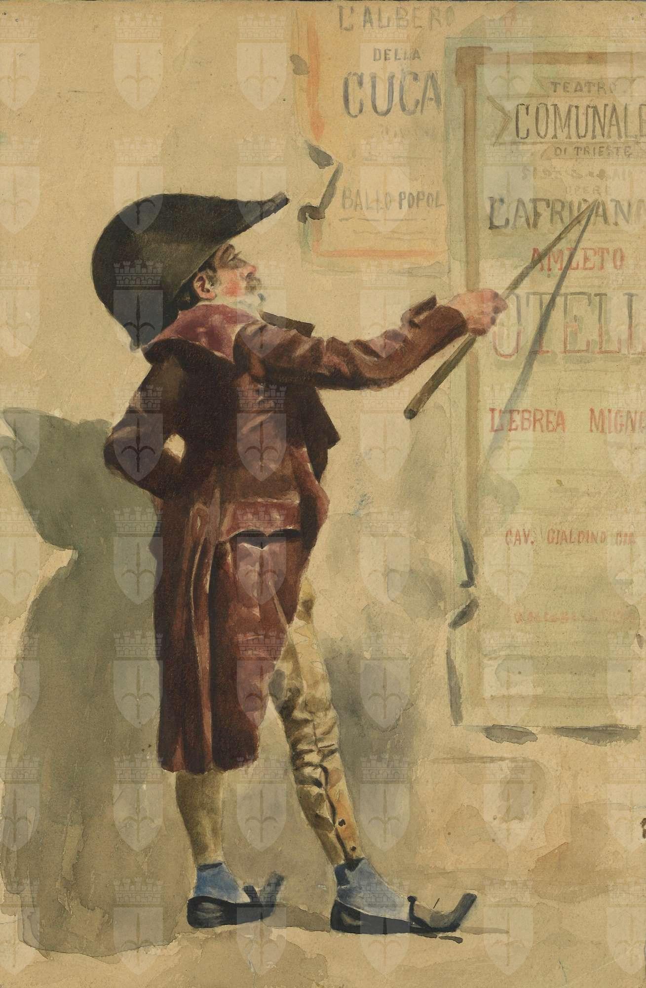 Valletto in costume in piedi in atto di indicare con una bacchetta un avviso teatrale