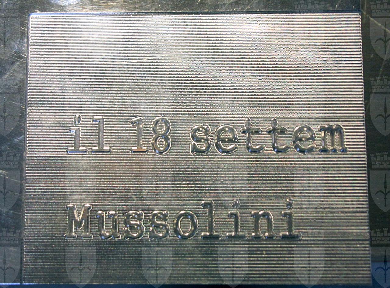 Si tratta della lastra “campione” della targa che è stata collocata nel 2013 a Trieste, in piazza dell'Unità d'Italia, per ricordare l'annuncio, da parte di Benito Mussolini, delle Leggi Razziali nel discorso ivi tenuto il 18 settembre 1938. La piastra è stata fatta realizzare al fine di visionarne preventivamente l’effetto finale, in termini di qualità estetica e requisiti di sicurezza. L'iscrizione sulla targa riporta la seguente frase: "Il 18 settembre 1938 / Mussolini / scelse questa piazza / per annunciare / l'emanazione delle / leggi razziali antiebraiche / macchia incancellabile / del regime fascista e / della monarchia / italiana / Comune di Trieste / 18 settembre 2013".