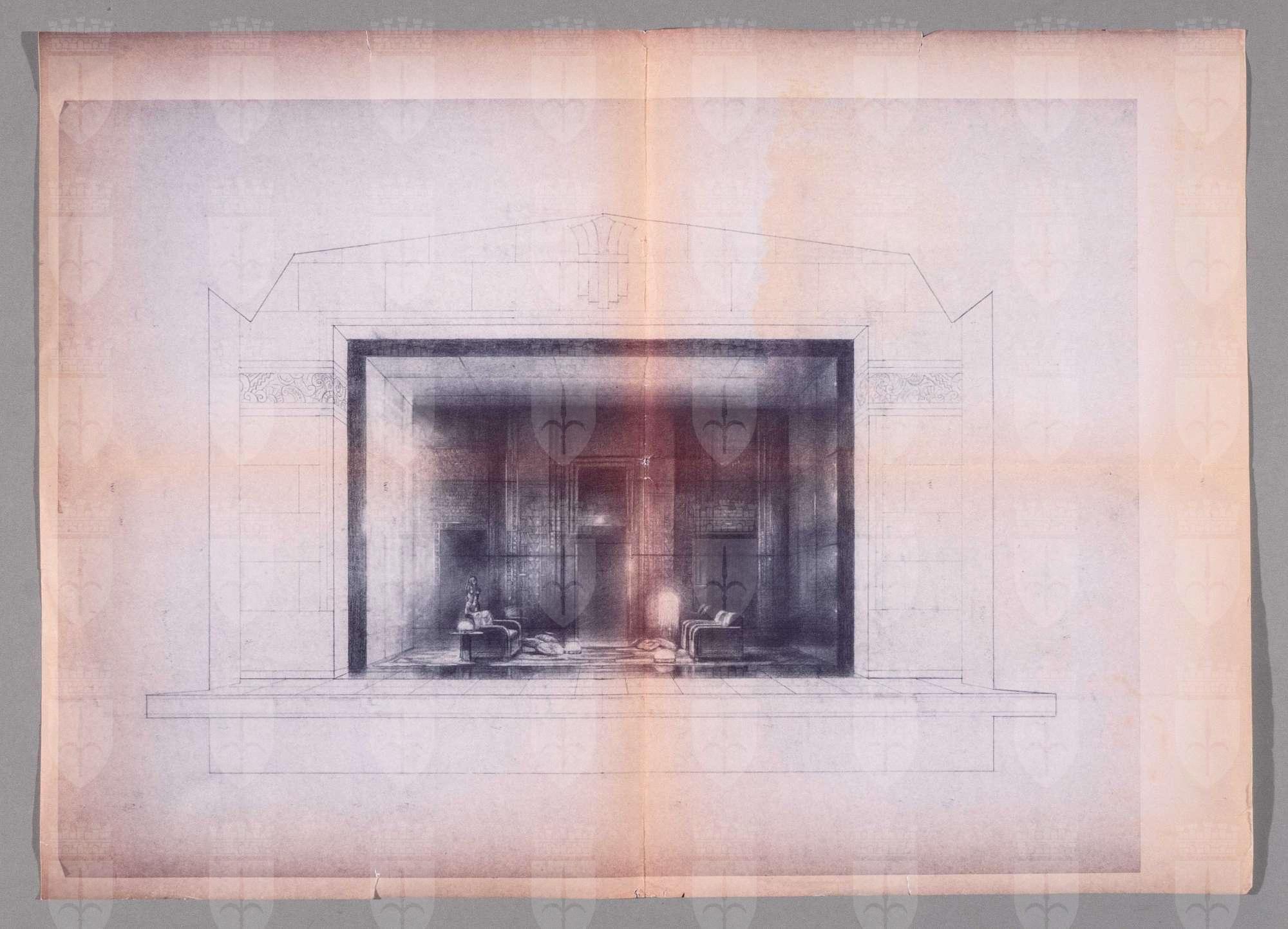 Come tu mi vuoi, dramma di Luigi Pirandello, atto 1. Interno con salotto elegante, divani, cuscini, tavolo, lampade e scultura. Tre porte si aprono sullo sfondo. L'ambiente è contornato da una cornice massiccia