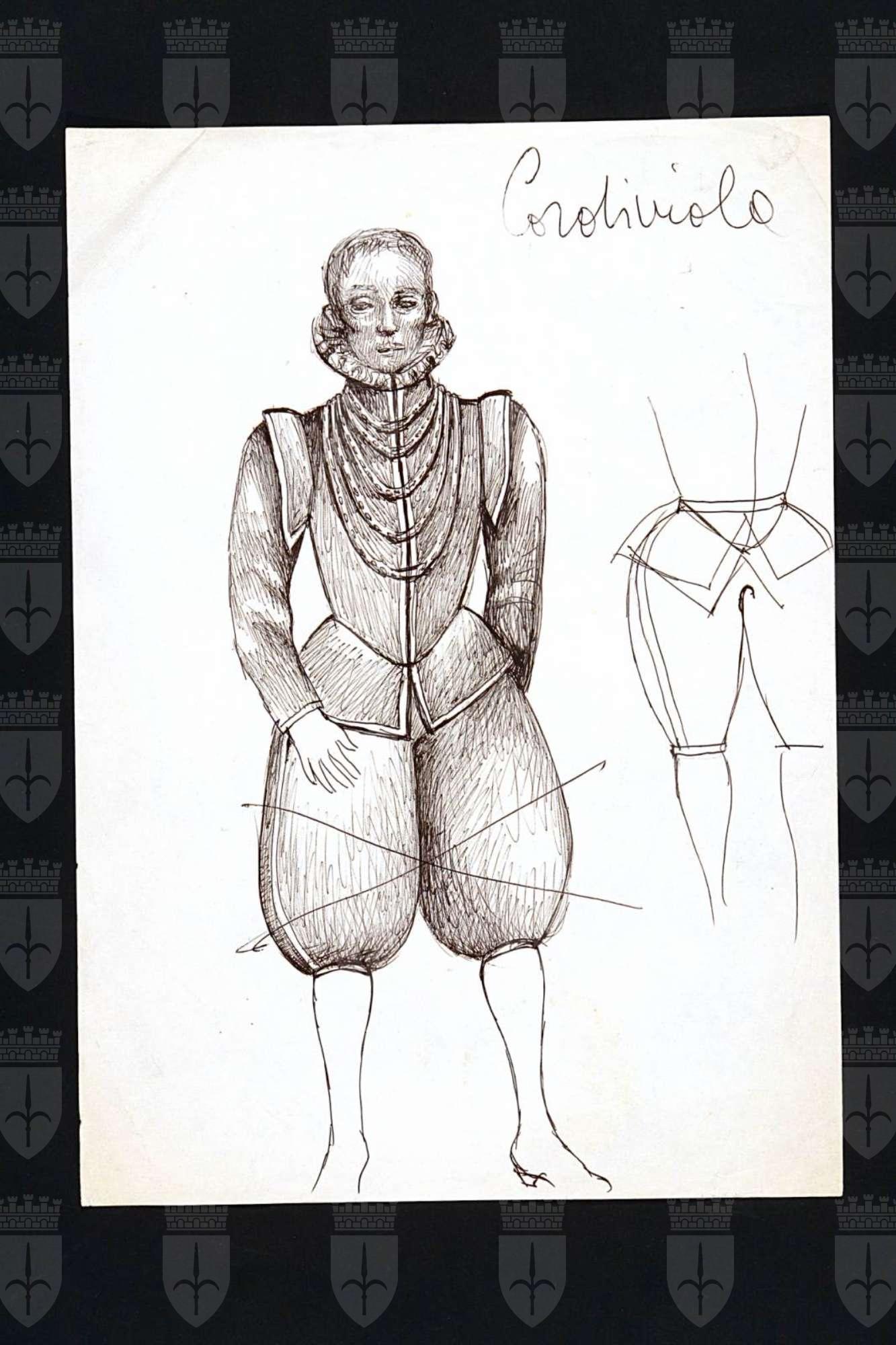 Come vi piace, commedia pastorale di William Shakespeare. Figura maschile intera, di fronte, in abito cinquecentesco, brache ampie cancellate con due tratti a penna e a destra schizzo per altro modello di brache meno ampie