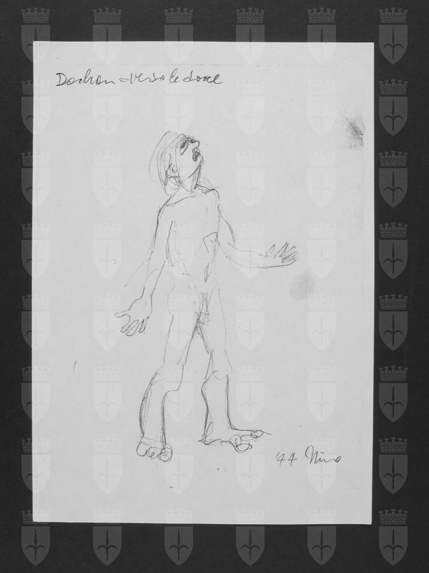 Il disegno rappresenta una persona nuda, che avanza con le braccia allargate, il volto verso l'alto, resa con pochi tratti di matita che danno l'idea della tragicità del momento.
